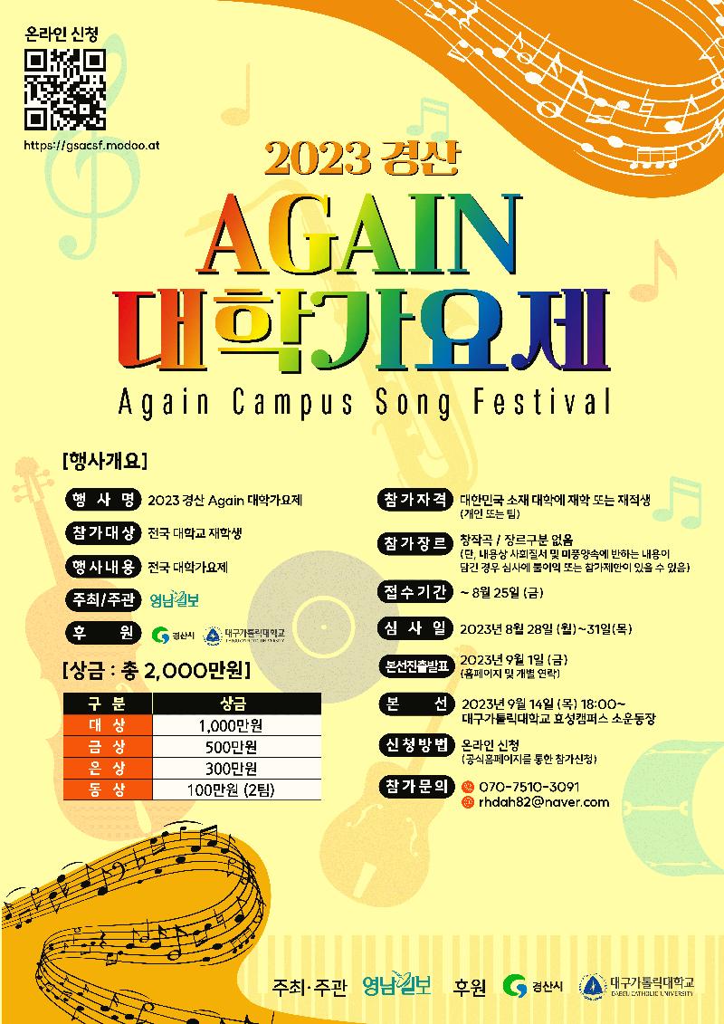 📣참가신청은 홈페이지 상단 [참가신청] 클릭 or https://gsacsf.modoo.at/?link=35icsk1o [링크] 접속 1️⃣경산 Again대학가요제 개요 ✅ 행사명: 경산 Again대학가요제 ✅ 접수기간: 2023년 7월 26일(수) \~ 8월 25일(금) ✅ 온라인 예선 : 8월 28일 (월)\~31일 (금) ✅ 본선진출발표 : 9월1일(금) (홈페이지 및 본선 진출자 개별 연락) ✅ 본선 : 9월14일(목) 대구가톨릭대학교 효성캠퍼스 소운동장 2️⃣경산 Again대학가요제 참가신청 ✅ 참가자격 : 🔹 대한민국 소재 대학에 재학 또는 재적생 ※ 개인 또는 팀 ✅ 참가장르 : 창작곡 / 장르구분 없음 (단, 내용상 사회질서 및 미풍양속에 반하는 내용이 담긴 경우 심사에 불이익 있을 수 있음) ✅ 신청방법: 경산 Again대학가요제 홈페이지를 통한 온라인 신청 https://gsacsf.modoo.at/ ✅ 파일 제출양식: 홈페이지 참가 신청 작성 후 신분확인서류 및 프로필 영상 제출 (필수) *full hd (1920 x 1080 해상도 이상) mp4 권장 🔹 보내는 곳 : rhdah82@naver.com (팀명, 파일 등) 3️⃣ 경산 Again대학가요제 상금 🔹 대상 : 1팀(명) 1,000만원 🔹 금상 : 1팀(명) 500만원 🔹 은상 : 1팀(명) 300만원 🔹 동상 : 2팀(명) 100만원 4️⃣ 접수 및 문의 🔹 e-mail : rhdah82@naver.com 🔹 전 화 : 070-7510-3091 (평일 10:00 \~ 17:00) 5️⃣ 주최 / 주관 / 후원 🔹 주최/주관 : 영남일보 🔹 후원 : 경산시 / 대구가톨릭대학교 6️⃣ 유의사항 🔹 아래의 유의사항을 위반할 경우, 심사대상에서 제외할 수 있고 수상후에라도 위반사항이 확인될 시 수상을 취소하고 상금을 반환할 수 있음을 숙지하여 주시기 바랍니다. - 창작곡은 2020년 이후 본인의 순수창작물로\, 표절곡은 수상 제외 - 창작곡의 저작권·초상권·지적재산권(음원\, 영상\, 이미지\, 일러스트\, 폰트 등)침해\, 명예훼손\, 표절 등의 분쟁에 따른 모든 민·형사상법적 책임은 응모자에게 있으며\, 시상 후에도 이와 같은 사실이 밝혀진 경우 해당 수상 취소 및 상금 환수됨. - 대학가요제 주제 및 취지에 맞지 않는 광고성\, 상업성\, 부적절한 콘텐츠는 심사대상에서 제외함.