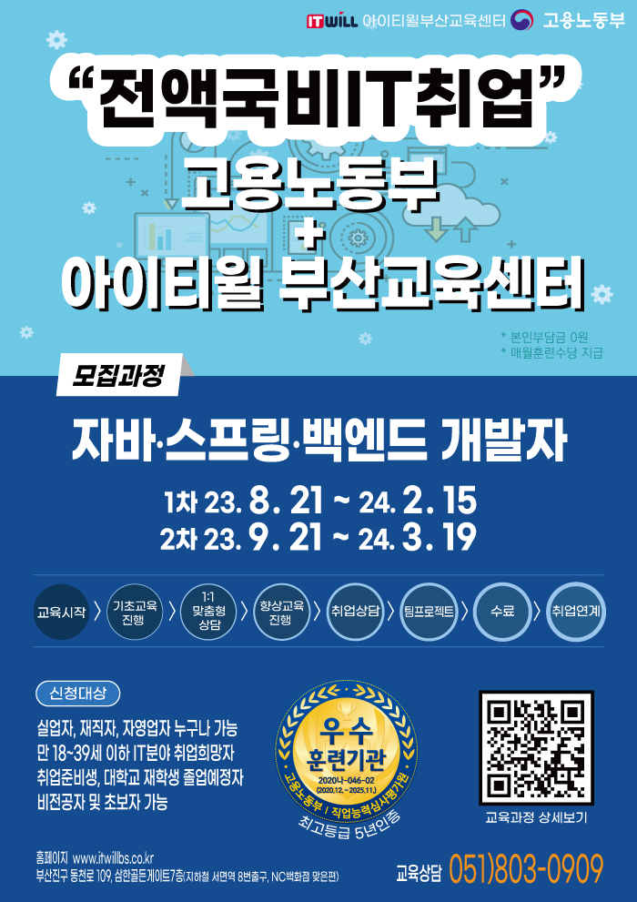고용노동부 우수훈련기관 아이티윌 부산교육센터 "IT취업교육" 훈련생 모집! ★아이티윌 수강특전★ 국가직무능력표준(NCS)를 기반으로 한 NCS 인증 교육과정 서울 강남 아이티윌과 연계, 희망자 전원 취업 추천 산업체 현장 실무 특강 및 프로젝트 특강 담임제를 통한 주기적인 상담 및 사후관리 센터 운영 카페를 통한 강사핵심노트 및 최신 시험정보 제공 통합 실무프로젝트롤 통한 포트폴리오 완성 ∨ 교육신청 바로가기 https://itwillbs.co.kr/cmn/cnsl/atnl/cnslMain.do ∨ 수강후기 바로가기 https://itwillbs.co.kr/cmn/atnlnRvw/BBSMSTR_000000000042/hrdrvatnlnRvwList.do ■ 교육과정 및 교육일정 - 자바·스프링·백엔드 개발자 > 1차 개강 : 8/21 \~ 2/15 > 2차 개강 : 9/21 \~ 3/19
