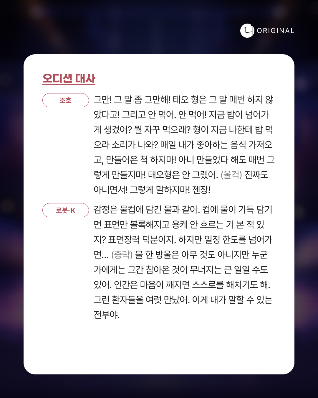 나디오 오리지널 콘텐츠 <죽은 형이 돌아왔다>는 형을 완벽하게 복제한 로봇K와 아이돌 멤버 조호가 그려네는 감동 휴먼 판타지입니다.