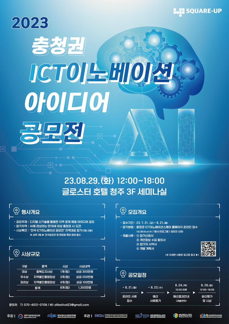 문의 : -충청권 ICT이노베이션스퀘어 아이디어 공모전 담당자 ❍ ☎ 070-4012-0708, aifestival23@gmail.com ❍ ☎ 043-210-0895
