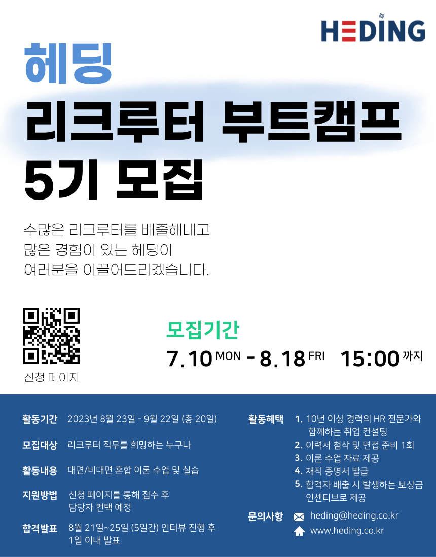 리크루터 부트캠프는 인재채용 플랫폼 HEDING에서 진행하는 프로그램으로, HR 산업 진출을 희망하는 취준생분들께 산업에 대한 이해와 리크루터 업무 전반을 교육해드리고 실무 경험도 쌓을 수 있도록 도와드리는 프로그램입니다. 요즘 가장 떠오르는 직무, 리크루터 각 기업에서의 리크루터 채용 자체가 늘고 있습니다. 그 이유는? 시장이 변하고 있기 때문! 정시 채용이 줄어들고, 수시 채용이 늘어나면서 회사에 핵심 인재를 데려올 수 있는 리크루터 채용이 늘기 시작했는데요. 왜 리크루터를 선택해야 하는지부터, 어떻게 준비해야 하는지까지! 누구도 알려주지 않는 가장 베이직한 내용부터 실제 실무까지 수많은 리크루터를 배출해내고 많은 경험이 있는 헤딩이 여러분을 이끌어드리겠습니다. HR 산업 전문가와 함께하는 리크루터 부트캠프, 이론부터 실습, 전문가와의 멘토링까지! 이전 기수와는 다르게 대면 / 비대면을 혼합하여 이론 수업 및 실습을 진행하며 10년 이상 경력의 HR 전문가와의 취업 컨설팅, 이력서 첨삭 및 면접 준비를 제공합니다. HR업계 혹은 리크루터로의 직무 변경이나 취업을 희망하신다면 지금 신청하세요! 상세 내용: hedingbootcamp.oopy.io 신청 링크: https://tally.so/r/3jMXam 1. 교육 기간** 23.08.23 \~ 23.09.22 (4주 간 진행) 2. 교육 시간: 4주, 20일 과정 [이론 수업] 1주차