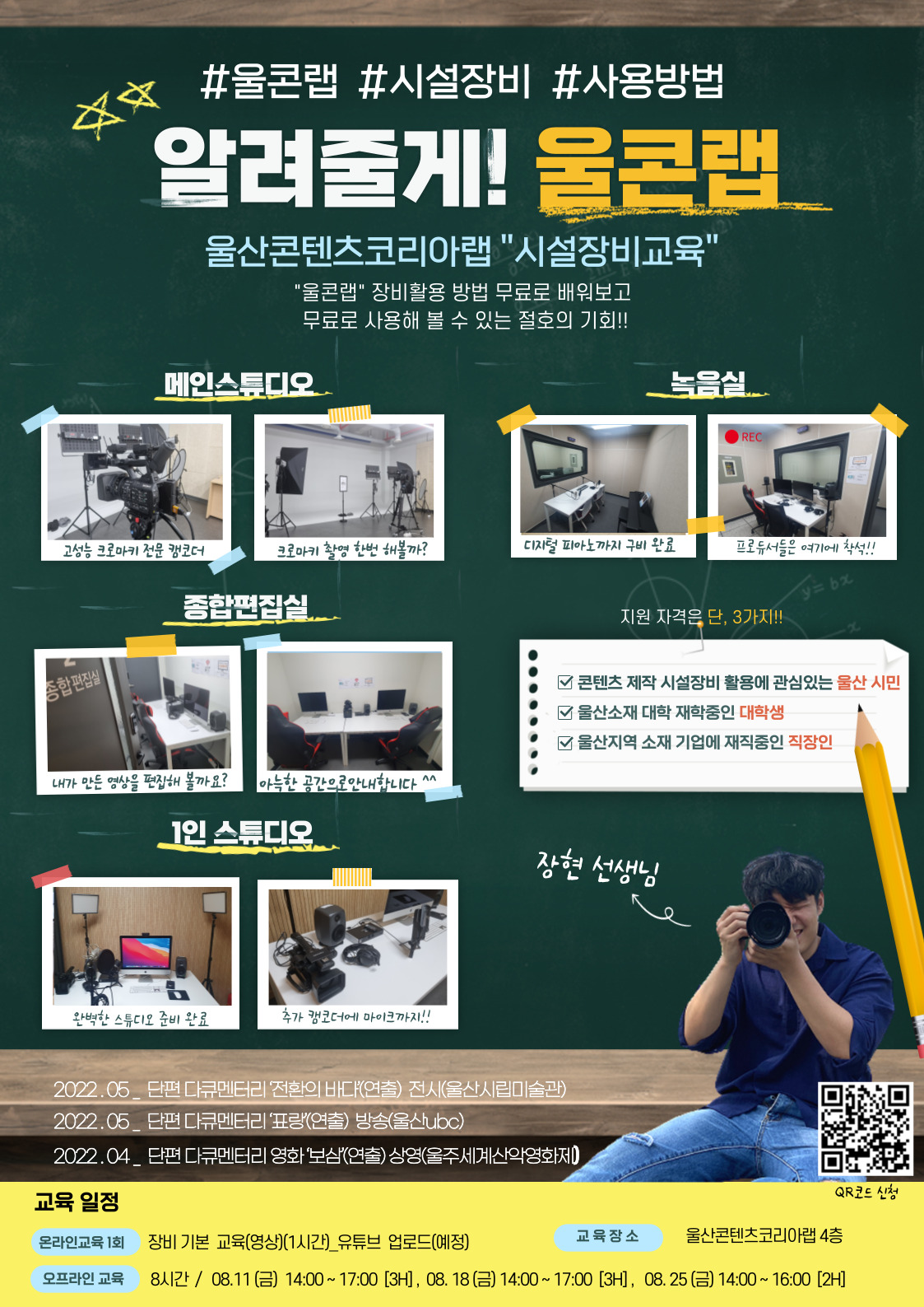 울산콘텐츠코리아랩 시설장비 교육 콘텐츠 창제작 교육 시설장비 교육 안내드립니다. ▶일시 동영상 교육-1시간(유튜브 업로드 예정) 오프라인 교육 8.11(금) 오후 14:00\~17:00 8.18(금) 오후 14:00\~17:00 8.25(금) 오후 14:00\~16:00 ▶교육강사 장현 강사님 전시(울산시립미술관) 단편 다큐멘터리 ‘전환의 바다’(연출) 방송(울산ubc) 단편 다큐멘터리 ‘표랑’(연출) 상영(울주세계산악영화제) 단편 다큐멘터리 영화 ‘보삼’(연출) ▶장소 : 울산콘텐츠코리아랩 ▶ 교육은 전액 무료입니다.!!! ▶ 신청방법 (step1) 구글폼접수(카드뉴스 QR 찰칵) (step2) 교육당일 신청서작성 많은 신청 부탁드립니다 자세한 사항은 콘집홈페이지 참조 https://conzip.uipa.or.kr