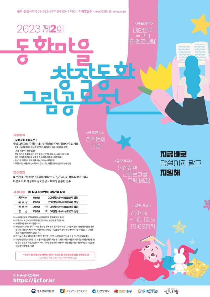 (재)인천중구문화재단에서 개항희망문화상권 내 동화마을 리뉴얼 사업의 조형 개선을 위한 콘텐츠 확보와 신인동화 작가를 발굴하기 위한 제2회 동화마을 창작동화 그림 공모전을 실시합니다. 이번 공모전은 창작동화에 관심 있는 대한민국 국민 누구라면 참여할 수 있습니다. 2023년 제2회 동화마을 창작동화 그림 공모전에 많은 지원과 관심 부탁드립니다.