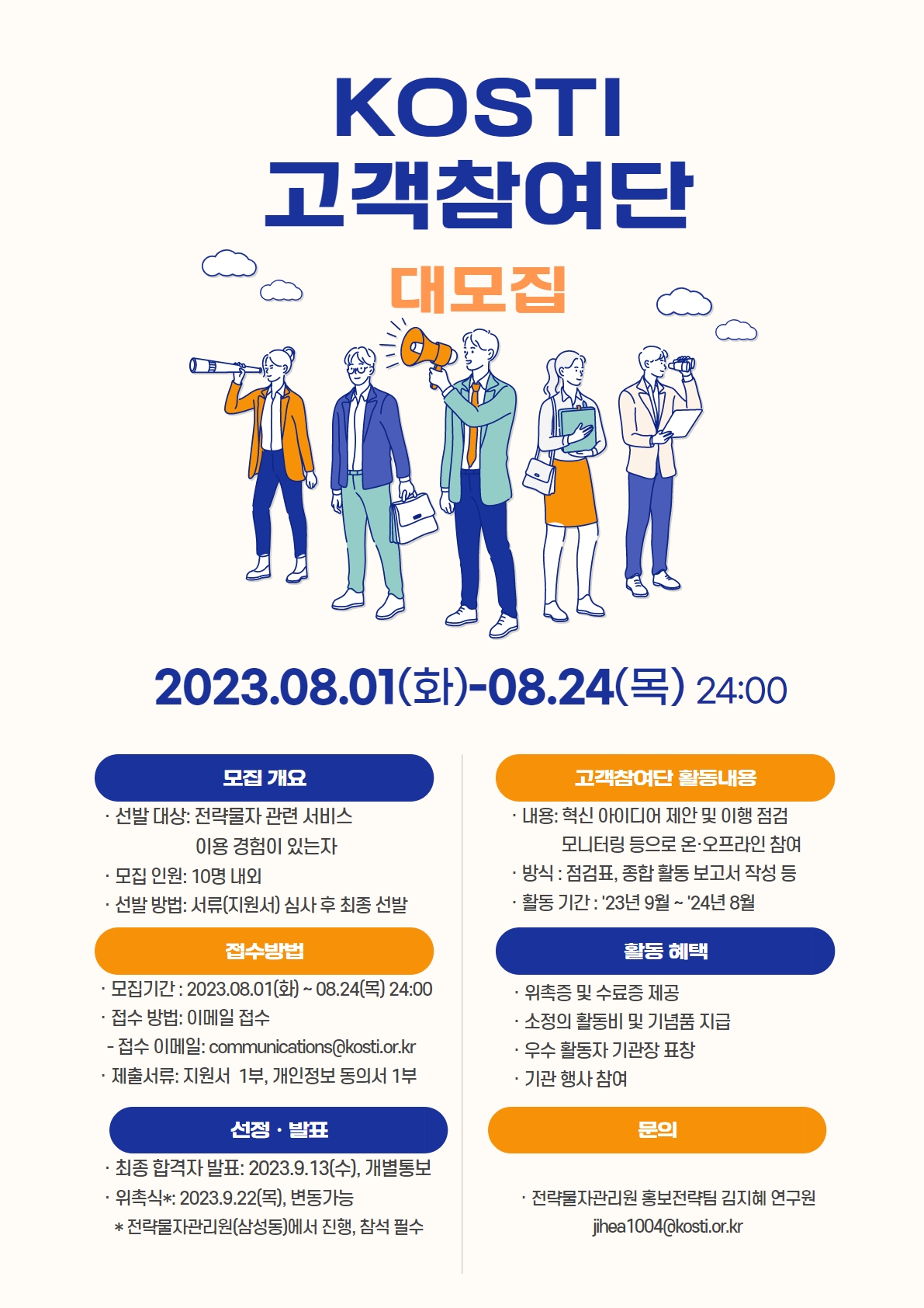 ■ 모집 개요 1. 선발대상: 전략물자 관련 서비스 이용 경험이 있는 자 2. 모집인원: 10명 내외 3. 선발방법: 서류 심사(자기소개\, 지원동기 등) 후 최종 선발 ■ 활동 내용 1. 활동내용: 혁신 아이디어 제안 및 이행 점검 모니터링 등의 온·오프라인 참여 2. 활동방식: 사전 배부하는 점검표 작성\, 종합 활동 보고서 작성 3. 활동기간: 2023년 9월 부터 2024년 8월 까지 ■ 활동 혜택 1. 전략물자관리원 고객참여단 위촉증 및 수료증 제공 2. 소정의 활동비 및 기념품 지급 3. 우수 활동자 기관장 표창 4. 기관 행사 참여 ■ 접수 방법 1. 접수 일정: 2023년 8월 1일(화) \~ 2023년 8월 24일(목) 24:00 2. 접수 방법: 이메일 접수 communications@kosti.or.kr 3. 제출서류 - 지원서 1부 및 개인정보 활용 동의서 1부 (첨부파일 참조) ■ 선정·발표 1. 최종 합격자 발표: 2023년 9월 13일(수) (개별 통보) 2. 위촉식*: 2023년 9월 22일(목) 오전 10:00 (변동 가능\, 변동 시 사전 통보 예정) * 전략물자관리원(서울시 영동대로 511,16층)에서 진행, 참석 필수 ■ 문의 - 전략물자관리원 홍보전략팀 김지혜 연구원 (jihea1004@kosti.or.kr)