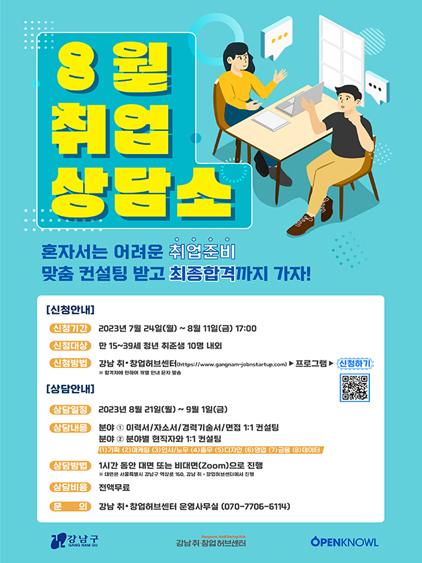[신청안내] 🟧신청기간 : 2023년 7월 24일(월) \~ 8월 11일(금) 17:00 🟧신청대상 : 만 15\~39세 청년 취준생 10명 내외 🟧신청방법 : 강남 취•창업허브센터(http://www.gangnam-jobnstartup.com/) > 프로그램 > 신청하기 ※ 자세한 내용은 홈페이지를 통해 확인 바랍니다. [참여혜택] 🟧공간대관: 강남취창업허브센터 스터디룸 당일 또는 1일전 예약권 (1회) ※ 예약 현황에 따라 변동 될 수 있습니다. 🟧취업 정보: 카카오 플러스 친구를 통해 강남 취•창업허브센터 프로그램 정보 제공 🟧음료제공: 강남 취•창업허브센터 무료 음료 쿠폰 제공 (1회)