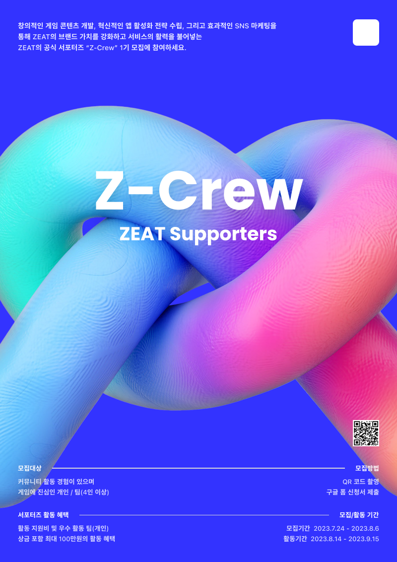 - 활동 지원비 및 우수 활동 팀(개인) 상금 포함 최대 100만 원 - ZEAT 앱 내 유료 서비스 무료 사용 - 스타트업의 고민을 함께 풀어가며 실제 문제를 해결하는 능력을 기를 수 있는 현업 실무 참여 기회 제공 - 게임 및 블록체인 산업의 실무자들과 네트워킹을 할 수 있는 기회 제공 - 활동을 성실히 수행한 여러분들께 "서포터즈 활동 인증서" 발급 - 향후 인턴십 선발 시 우대 ❗우수 활동 팀에게는 더 많은 혜택과 ZEAT와의 직접적인 협업 기회가 포함되어 있는 3개월 동안의 파트너십 기회를 제공할 예정입니다.
