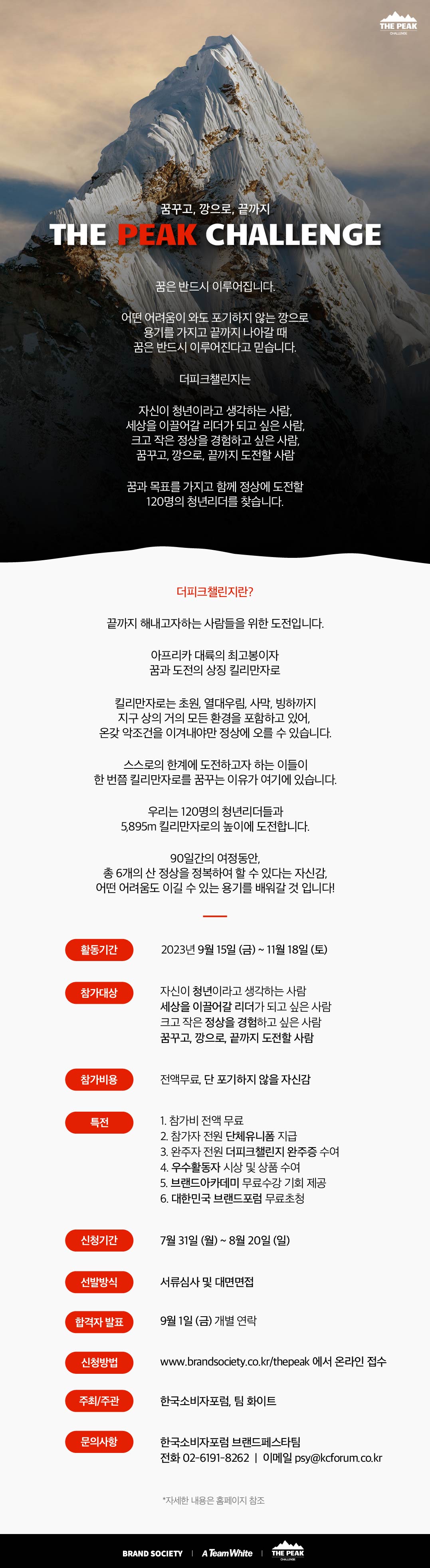 1. 더피크챌린지(THE PEAK CHALLENGE)에 대하여 5,895m 킬리만자로의 높이에 도전할 120명의 청년리더를 모집합니다! 더피크챌린지는 끝까지 해내고자 하는 사람들을 위한 도전입니다. 쉽지 않은 킬리만자로의 높이, 5,895m 산 정상을 하나씩 정복해 나가며 할 수 있다는 자신감, 스스로에 대한 믿음 정상에 서는 경험. 그리고 그 길을 함께하는 사람들 올 가을 우리는, 6개의 산 정상을 오르며 얼마나 높이 오를 수 있는지 하나씩 기록할 것입니다. 그리고 우리가 함께 성공의 경험들을 만들어 갈 것입니다. 브랜드소사이어티 팀 화이트에서는 더피크챌린지_5,895m, 킬리만자로의 높이에 도전할 120명의 청년들을 모집합니다. 2. 팀 화이트가 더피크챌린지를 진행하게 된 이유는 무엇인가요? 올해로 12주년을 맞이한 팀 화이트는 청년리더를 꿈꾸는 학생들이 모인 곳입니다. 리더는 어떠한 위기와 어려움에도 이루고자 하는 바를 반드시 해내는 힘을 가지고 있습니다. 하지만 이는 단시간에 얻어지는 것이 아니기에 끊임없는 훈련이 필요합니다. 그래서 팀 화이트는 학생들이 끝까지 정상에 오르는 훈련을 꾸준히 함으로써 근성을 갖춰 청년리더로 성장할 수 있도록 더피크챌린지를 진행하고자 합니다.