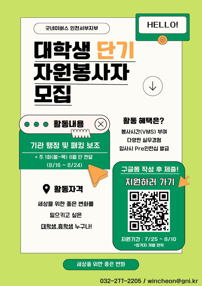 굿네이버스 인천서부지부 단기 자원 봉사자 모집 ■ 활동내용 기관 행정 및 패킹 보조 ■ 활동기간 8/16 \~ 8/24 주1회(월\~목) 10:00 \~ 17:00 ■ 지원방법 구글폼 작성 후 제출 ↓↓↓지원하러가기↓↓↓ https://docs.google.com/forms/d/e/1FAIpQLSetbmLVeG0fQmuXSWn_jtxhIHMdZzS71ZDvT2NS7AXB85uNgQ/viewform?usp=sf_link *합격자 개별 연락 ■ 활동혜택 다양한 실무경험 봉사시간(VMS)인증 수료증 발급 입사시 Pre 인턴십 발급 NGO 분야별 사업 경험 ■ 문의 굿네이버스 인천서부지부 (032-277-2205)