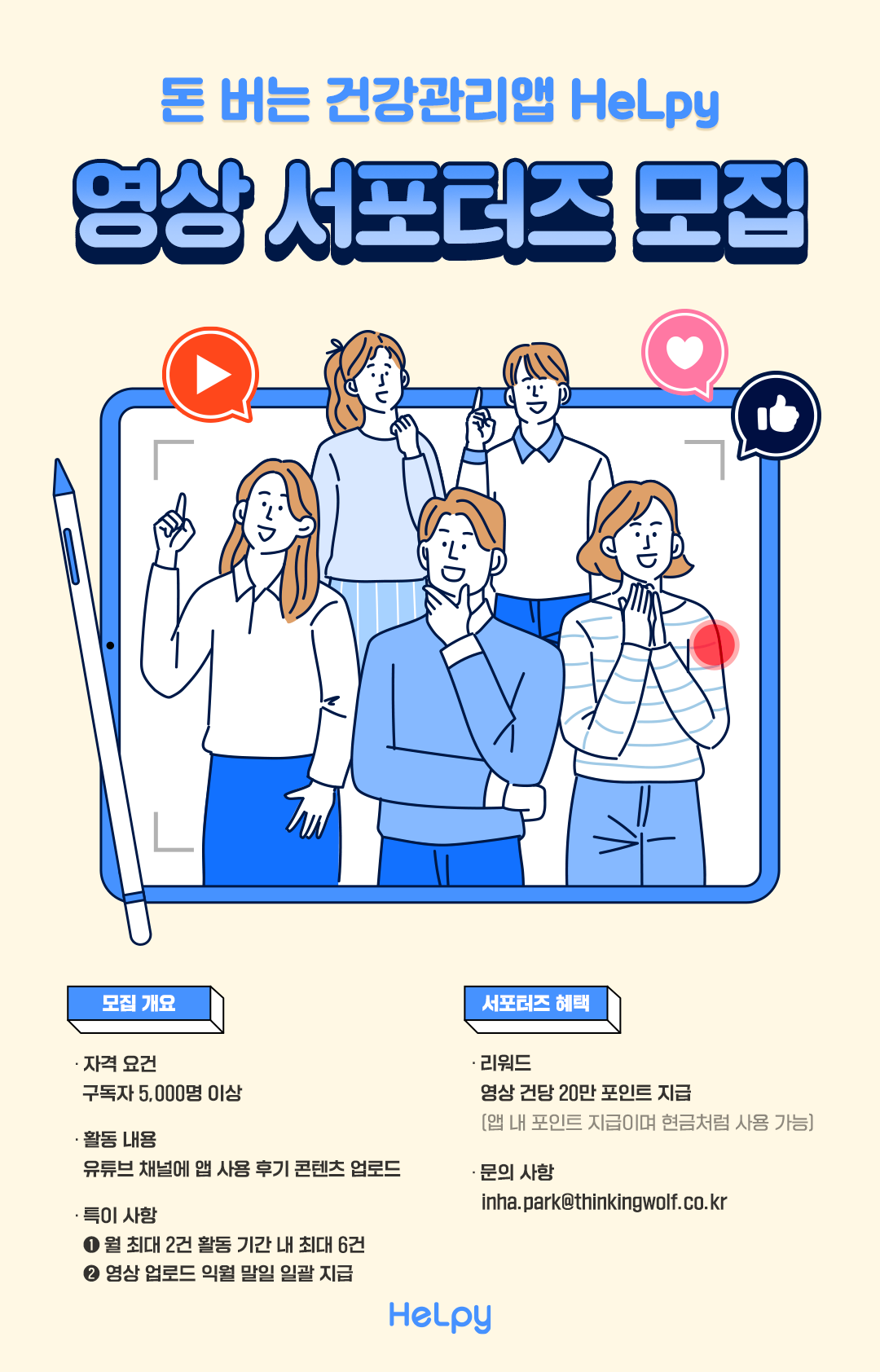 [헬피]에서 유튜버 서포터즈를 모집합니다. - 자격 요건 : 구독자 5\,000명 이상 - 활동 내용 : 유튜브 채널에 앱 사용 후기 콘텐츠 업로드 - 특이사항 : 1) 월 최대 2건, 활동 기간 내 최대 6건 콘텐츠 업로드 필요 2) 영상 업로드 익월 말일에 리워드 포인트 일괄 지급 - 서포터즈 혜택 1) 리워드 : 영상 건당 20만 포인트 지급 2) 우수 활동자 1명 매월 100만원 지급 - 접수 URL : https://form.office.naver.com/form/responseView.cmd?formkey=Yzc3ZjJhZDQtMzNiNy00YTE4LWJlN2EtYjJmMTEwMTljNzNh&sourceId=editor
