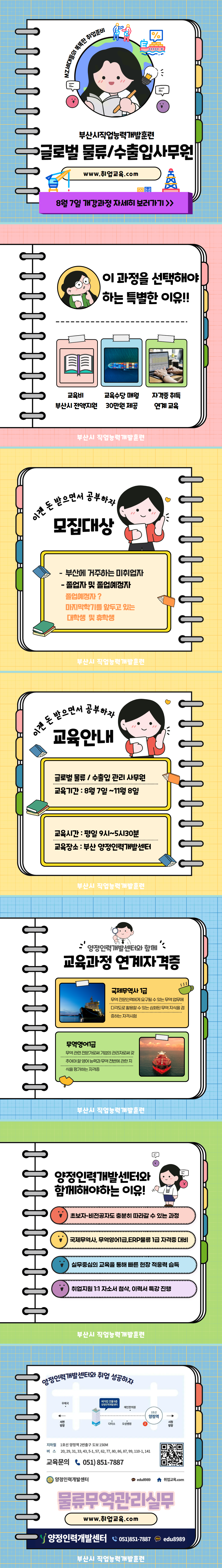 💡[부산시 직업능력개발훈련 교육생 모집안내]💡 ☑ 물류/무역분야 취업에 관심있다면? ☑ 물류/수출입분야 실무경험을 하고 싶다면? ☑ 취업에 필요한 관련 자격증이 필요하다면? ☑ 포워딩/물류관리/무역사무 등 분야 취업 스펙 쌓고 싶다면?