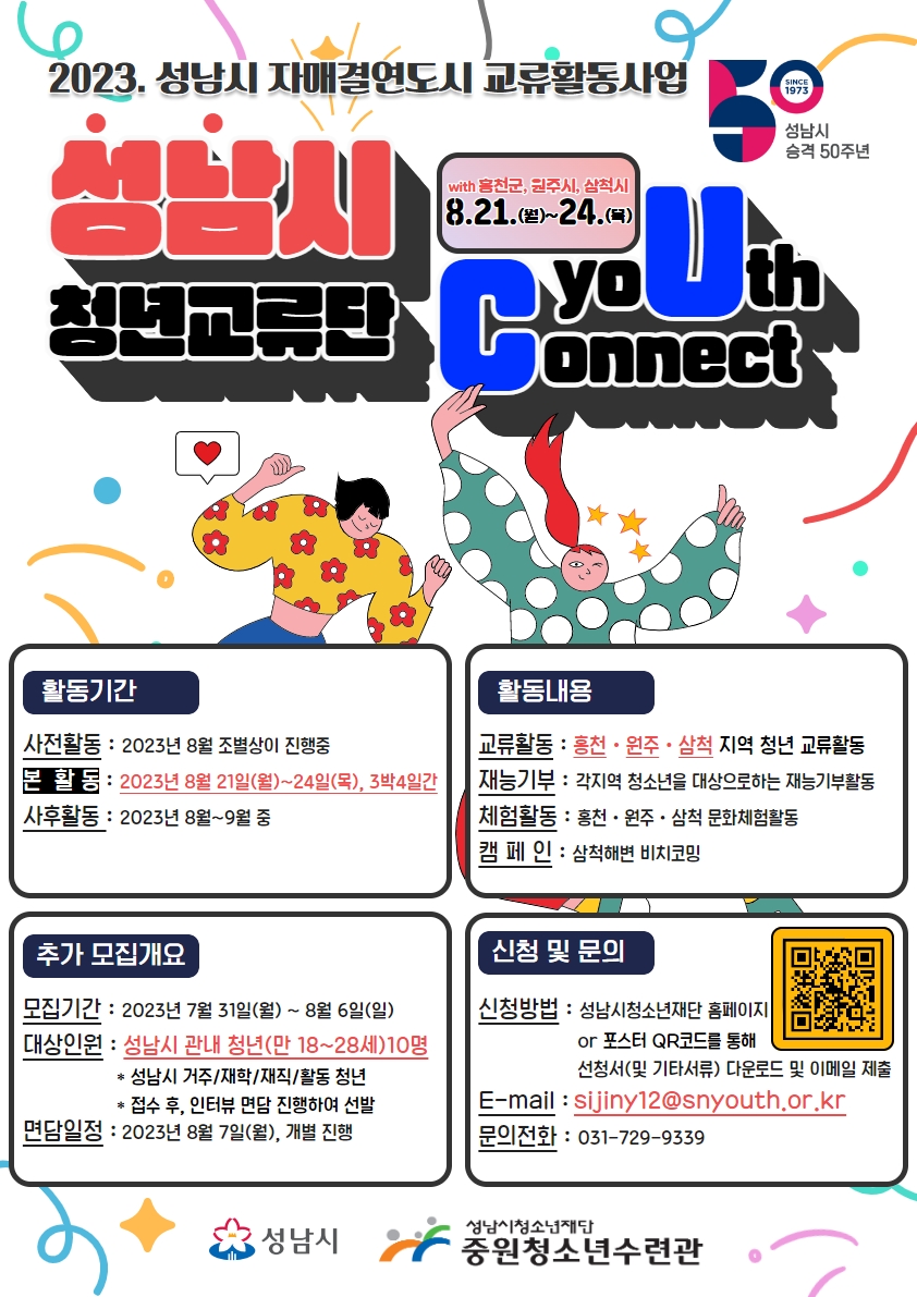 성남시 및 성남시청소년재단 중원청소년수련관에서 자매결연도시(원주시, 삼척시, 홍천군)와 성남시 간의 상호교류 및 성남시 시승격 50주년 홍보활동, 원주/삼척/홍천 문화탐방활동, 청소년 재능기부, 캠페인 등을 진행하고자 합니다. 성남시 청년 여러분의 많은 참여 바랍니다.