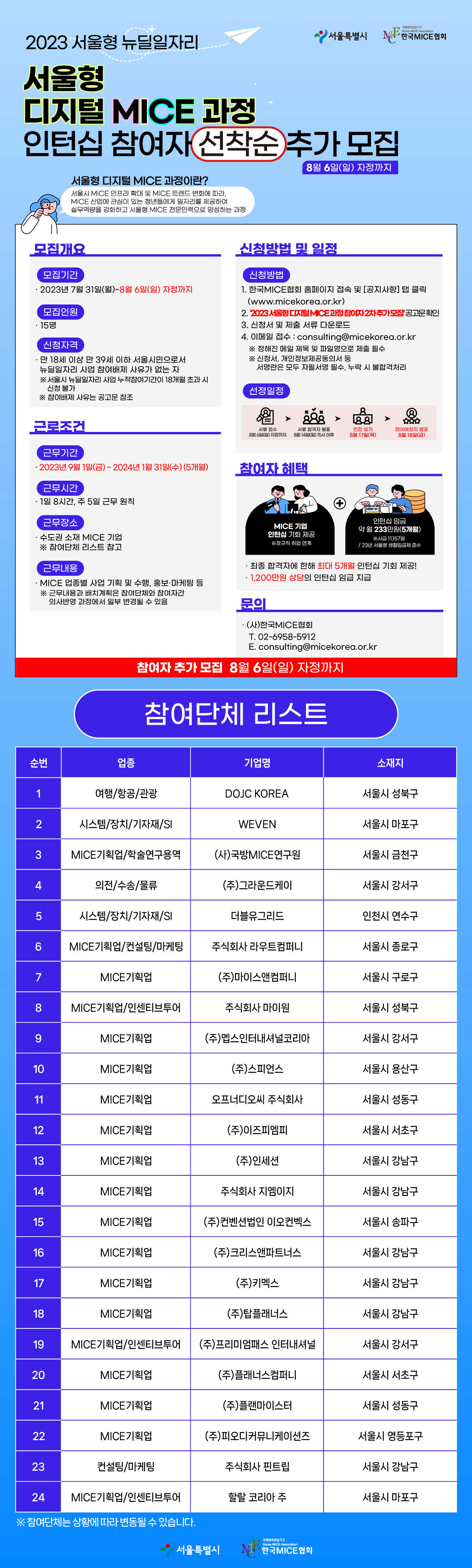 2023년 서울형 뉴딜일자리 서울형 디지털 MICE 과정 참여자 모집공고 MICE 산업에 관심이 있고 MICE 업계에 종사하기를 원하는 청년들에게 MICE 기업에서의 인턴 기회를 제공하여, 실무역량을 강화하고 전문가로의 성장을 지원하는 「2023 서울형 디지털 MICE 과정」 의 참여자를 아래와 같이 모집합니다. 2023. 7. 31.