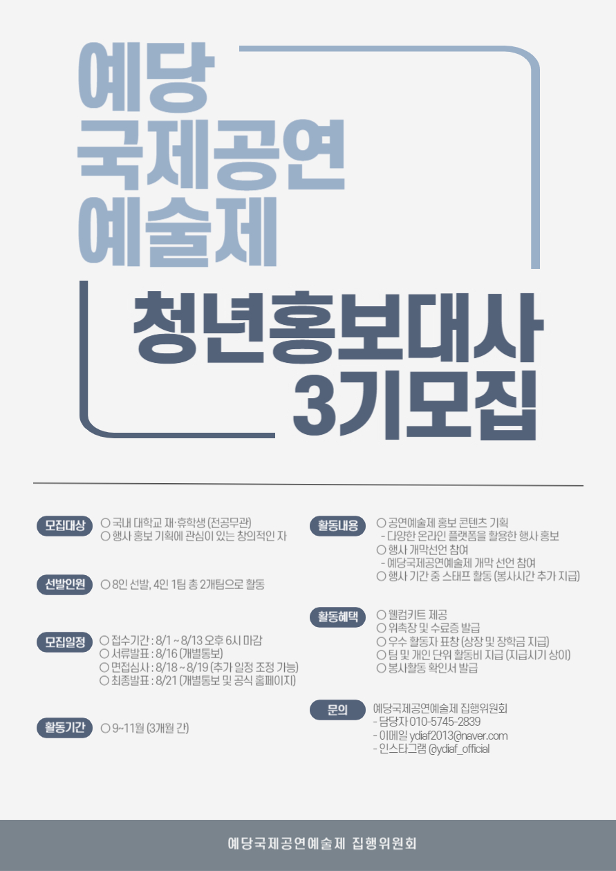 안녕하십니까? 예당국제공연예술제를 주최 주관하고 있는 예산연극협회입니다. 올해로 개최 11주년을 맞이한 충청 유일의 국제 공연 예술 행사인 예당국제공연예술제의 온라인 마케팅을 담당해주실 청년 홍보대사 여러분을 다음과 같이 모집합니다. ■ 모집대상 - 국내 대학교 재·휴학생 (전공무관) - 행사 홍보 기획에 관심이 있는 창의적인 자 ■ 선발인원 - 8인 선발, 4인 1팀 총 2개팀으로 활동 (공지된 인원에서 추가 선발 가능성 있음) ■ 모집일정 - 접수기간: 23.08.01\~08.13 오후 6시 마감 - 서류발표: 23.08.16 (개별통보) - 면접심사: 23.08.18\~08.19 (추가 일정 조정 가능) - 최종발표: 23.08.21 (개별통보 및 공식 홈페이지) ■ 활동기간 - 23.09\~11 (약 3개월) ■ 활동내용 - 공연예술제 홍보 콘텐츠 기획 (다양한 온라인 플랫폼을 활용한 행사 홍보) - 행사 개막선언 참여 (예당국제공연예술제 개막선언 참여) - 행사 기간 중 스태프 활동 (필수 X, 봉사시간 추가 지급) ■ 활동혜택 - 웰컴키트 제공 - 위촉장 및 수료증 발급 - 우수 활동자 표창 (상장 및 장학금 지급) - 팀 및 개인 단위 활동비 지급 (지급시기 상이) - 봉사활동 확인서 발급 등 ■ 지원방법 - 구글 폼을 통해 1차 지원 https://forms.gle/63JcsPcnQsgNnbLG7 - 서류 심사 후 면접 심사 대상자 개별 연락 - 면접 심사는 온라인 화상 프로그램인 네이버 웨일온을 통하여 진행 ■ 문의 예당국제공연예술제 집행위원회 - 담당자 010-5745-2839 - 이메일 ydiaf2013@naver.com - 인스타그램 @ydiaf_official ※ 본 프로그램은 예당국제공연예술제의 효과적인 마케팅을 위해, 행사가 진행되는 충남 예산 지역에 '극장 탐방 및 오리엔테이션' 목적으로 1회, 행사 기간 중 1회, 약 2회 정도의 참여를 권장드리고 있습니다. 참고하시기 바랍니다.