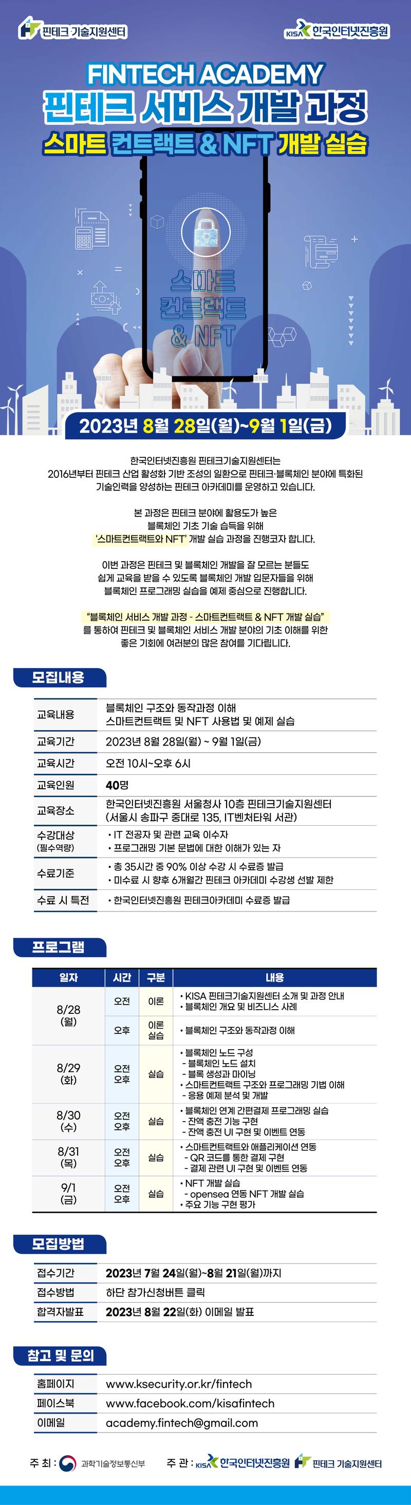 - 교육기간 : 2023년 8월 28일(월) \~ 9월 1일(금) / 5일 과정 - 교육시간 : 오전 10시 \~ 오후 6시 - 교육인원 : 40명 - 교육장소 : [오프라인] 핀테크기술지원센터(서울시 송파구 가락동 78 서관 10층)