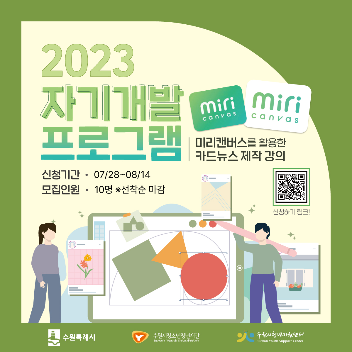 ✏️ 접수기간 : 7.28.(금) \~ 8.14.(월) ✏️ 접수대상 : 만 19세 \~ 34세 수원청년 10명 ※선착순 마감 ✏️ 강의일정 : 8.17.(목) \~ 8.31.(목) 매주 화/목 ✏️ 강의시간 : 19:00 \~ 21:30 ✏️ 강의계획 - 1회차 : 미리캔버스 베이직기초 - 2회차 : 미리캔버스 베이직 응용 - 3회차 : 미리캔버스 베이직 플러스 - 4회차 : 미리캔버스 마스터 심화 - 5회차 : 미리캔버스 마스터 고급 ✏️ 강의장소: 수원시청년지원센터 청년바람지대 3층 다목적실 ✏️ 준비물 : 개인 노트북, 프로필에 사용할 사진 ※ 신청자가 많을 시 조기 마감 될 수 있습니다. ※ 노쇼/연락 두절 시 본 센터 프로그램에 영구적으로 제한됩니다. ☎ 031- 267-3627