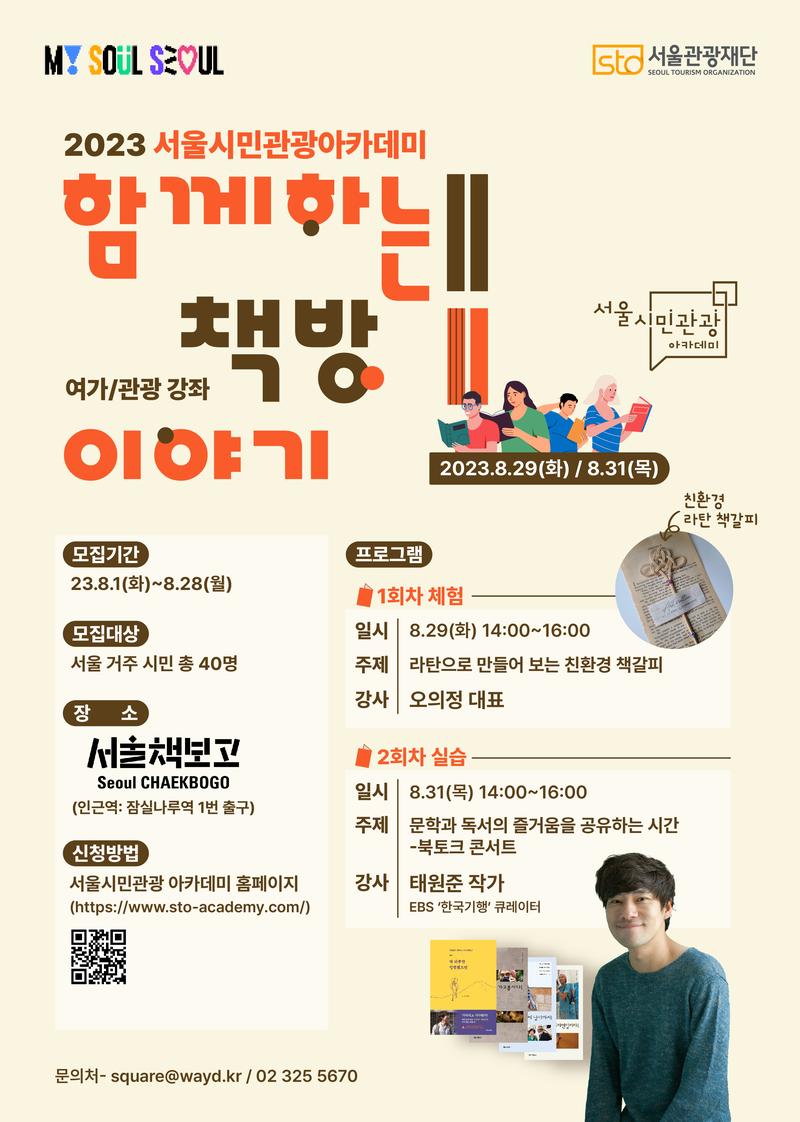 [함께하는 책방 이야기] ✅모집기간 : 23.8.1.(화)\~8.28.(월) ✅모집대상 : 서울 거주 시민 40명 ✅특강일정 : 23.8.29.(화) / 8.31.(목) 14:00 \~16:00 ✅교육장소 : 서울책보고