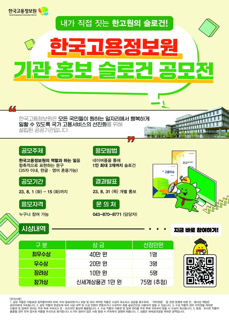 ✨한고원 기관 홍보 슬로건 공모전 ✨ 한국고용정보원 기관 홍보 슬로건 공모전을 개최합니다 ! 👏🏻 한고원을 잘 나타낼 수 있는 멋진 슬로건을 기다리겠습니다 .🙇🏻 ♂️🙇🏻 ♀️ 💡공모주제 : 한국고용정보원의 역할과 하는 일을 함축적으로 표현하 는 문구 (35자 이내, 한글·영어 혼용 가능) 💡공모기간 : 23.8.1.( 화)\~8.15.( 화 ) 💡결과발표 : 23.8.31.( 목 ) 💡응모방법 : 네이버폼을 통해 1 인 최대 3개까지 슬로건 제출 👉🏻https://naver.me/GmVMXJ7e 💡시상내역 - 최우수상 40만원 ( 1 명 ) - 우수상 20만원 ( 3 명 ) - 장려상 10만원 ( 5 명 ) - 참가상 신세계상품권 1만원 (75 명 ) 💡문의처 : 📞043-870 -8771