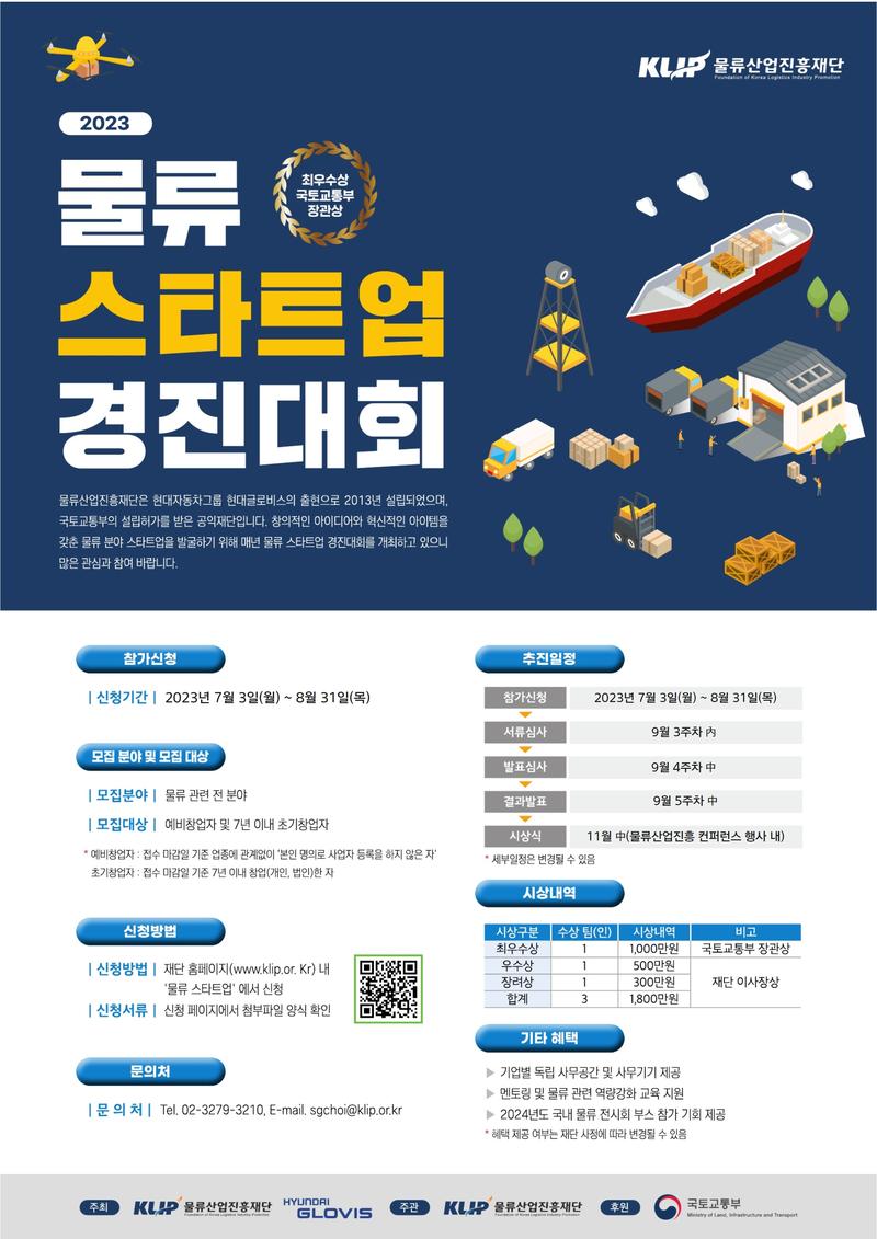 「물류 스타트업 경진대회」는 창의적인 아이디어와 혁신적인 아이템을 갖춘 물류 분야 스타트업을 발굴하기 위해 물류산업진흥재단에서 매년 개최하는 행사입니다. 수상자에게는 상금 및 인큐베이팅 혜택을 제공할 예정입니다. 물류 관련 전 분야의 예비·초기 창업자 분들의 많은 관심과 참여 부탁드립니다. 물류산업진흥재단