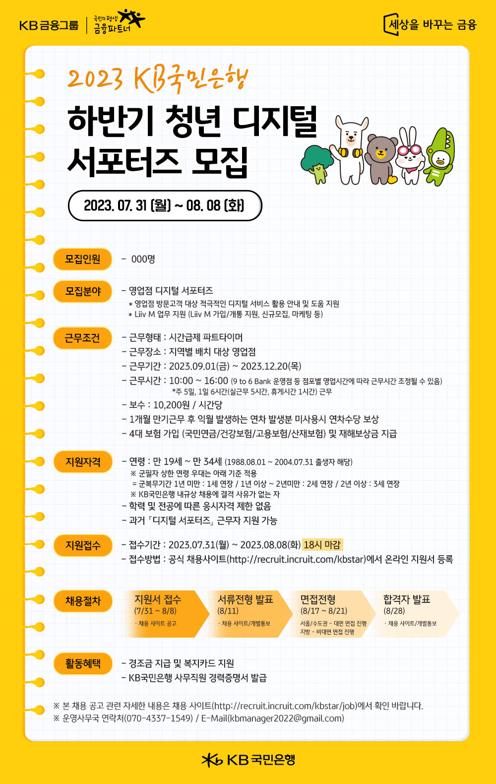 * 본 채용 공고 관련 자세한 내용은 채용 사이트(https://recruit.incruit.com/kbstar/job/2307280012)에서 확인 바랍니다. *운영사무국 연락처(070-4337-1549)/E-mail(kbmamager2022@gmail.com)
