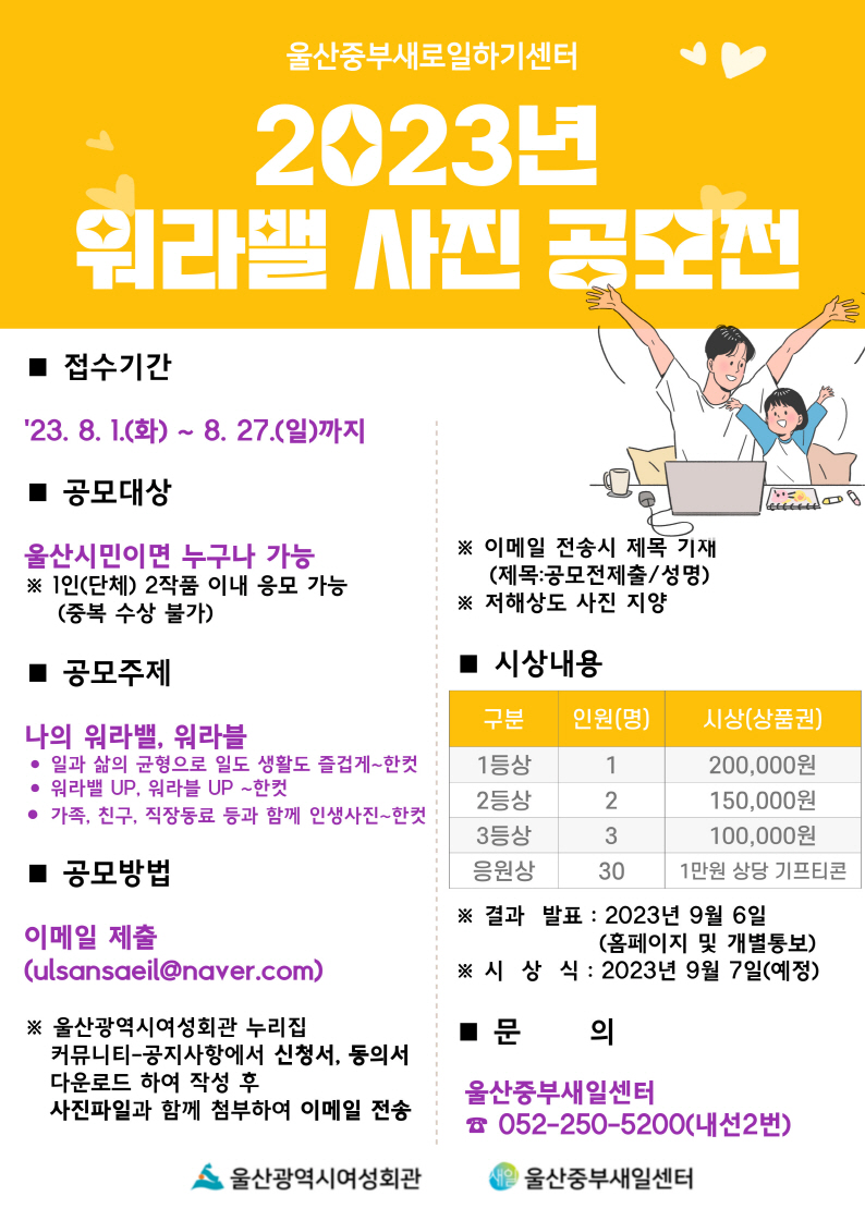 울산광역시중부새일센터에서는 2023년 경력단절예방 주간(9.7.\~9.13.)을 맞이하여 여성의 지속적인 근로 및 양성평등문화정착을 위하여 「2023년 워라밸 사진 공모전」을 다음과 같이 개최하오니, 관심 있는 분들의 많은 참여 바랍니다. 1. 공모개요 ○ 공 모 명 : 2023년 워라밸 사진 공모전 ○ 공모주제 : 워라밸 및 워라블 관련 자유주제 - 일과 삶의 균형으로 일도 생활도 즐겁게\~한컷 - 워라밸 UP\, 워라블 UP\~한컷 - 가족\, 친구\, 직장동료 등과 함께 인생사진\~한컷 ○ 참가대상 : 울산시민이면 누구나 가능 / 단 1인(단체) 2작품 이내 응모 가능(중복 수상 불가) ○ 접수방법 : 이메일 제출(ulsansaeil@naver.com) *참가신청서, 초상권 및 개인정보 수집·이용·제3자 제공 동의서 작성 후 사진 파일과 함께 이메일 제출(저해상도 사진 지양) *참가신청서와 동의서는 반드시 동의여부 및 서명 또는 날인 하여 이메일 제출 (제목:공모전제출/성명) ○ 접수기간 : 2023. 8. 1.(월) ∼ 8. 27.(일)까지 ○ 문 의 처 : 취업지원팀 ☎052-250-5238/ 052-250-5200(내선2번) 2. 발표·시상 ○ 최종발표 : 2023. 9월 6일(홈페이지 및 개별통보) ○ 시상규모 : 1-3등상 6명, 응원상 30명 (총 110만원)**