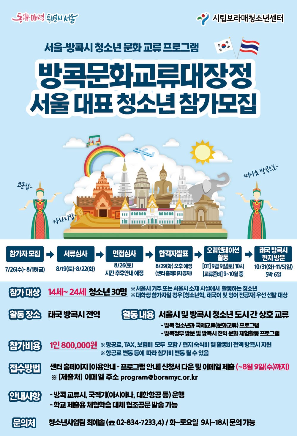 서울시와 방콕시의 국제교류 협약 체결을 통해 2007년부터 진행하고 있는 ‘서울-방콕 문화교류대장정’ 프로그램을 함께 할 ‘서울 대표 청소년’을 모집합니다! 많은 관심과 지원 바랍니다. * 활동내용 - 방콕 청소년 30명과 함께하는 도시 간 상호교류 프로그램 운영 - 방콕 랜드마크 및 문화체험, 방콕정부 방문 등 * 활동 특전 - 현지 숙식비 및 활동비 방콕시 지원 국제교류 활동을 통한 추억 남기기 방콕정부 방문 및 방콕시 전역 문화 체험활동 기회제공 단체티 지급 등 *활동 기간 2023년 10월 31일(화)\~11월 5일(일)까지 오리엔테이션 9월 9일(토) 10시 진행 예정(합격자 필수 참석요망) *모집 기간 \~ 2023년 8월 18일(금) 까지 *모집 대상 - 14세\~24세 청소년 30명 * 신청방법 - 센터 홈페이지 내 [프로그램 안내] 게시글 확인 후, 신청서 다운로드 및 작성 후 메일접수 (program@boramyc.or.kr) - 메일 제출 후, 확인 전화 필수 * 문의 시립보라매청소년센터 청소년사업팀 최예솔 (☎ 02-834-7233,4)