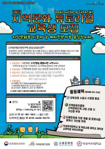 ○ 주최사 / 활동명 [문화체육관광부 주최 / 지역문화진흥원, 도봉문화원 주관] 2023 지역문화전문인력 양성사업 <2023 지역문화 튜토리얼:시작하기(기본과정)> 교육생 모집