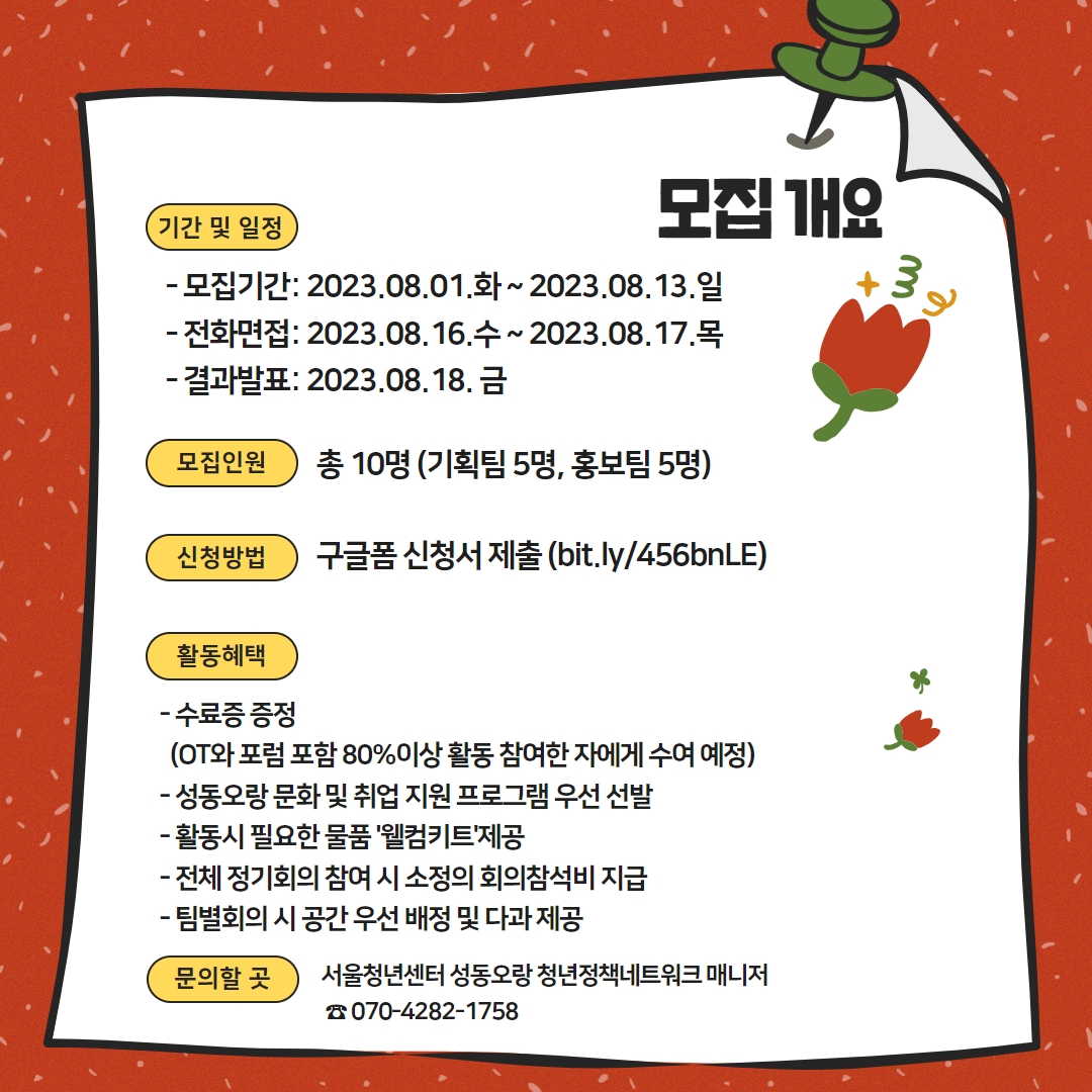 🔸 문의처 : 서울청년센터 성동오랑 청년정책네트워크 매니저(☎ 070-4282-1758)