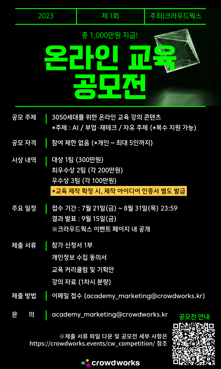 1. 공모 개요 - 주최 및 주관: 크라우드웍스 - 공모 기간: 2023.07.21(금) \~ 2023.08.31(목) 23:59까지 - 결과 발표: 2023.09.15 (금) ※크라우드웍스 이벤트 페이지 내 공개 및 당선자 한정 개별 연락 - 주제 :3050 세대를 위한 온라인 교육 강의 콘텐츠 (*주제별로 복수 지원 가능합니다.) 1) AI 관련 온라인 교육 2) 부업·재테크 3) 이 외 자유 주제- 공모 자격: 제한 없음 (*개인 1인 \~ 최대 5인 팀 이내로 참여 가능) - 시상 - 대상 1팀 (300만원) - 최우수상 2팀 (각 200만원) - 우수상 3팀 (각 100만원) *교육 제작 확정 시, 제작 아이디어 인증서 별도 발급