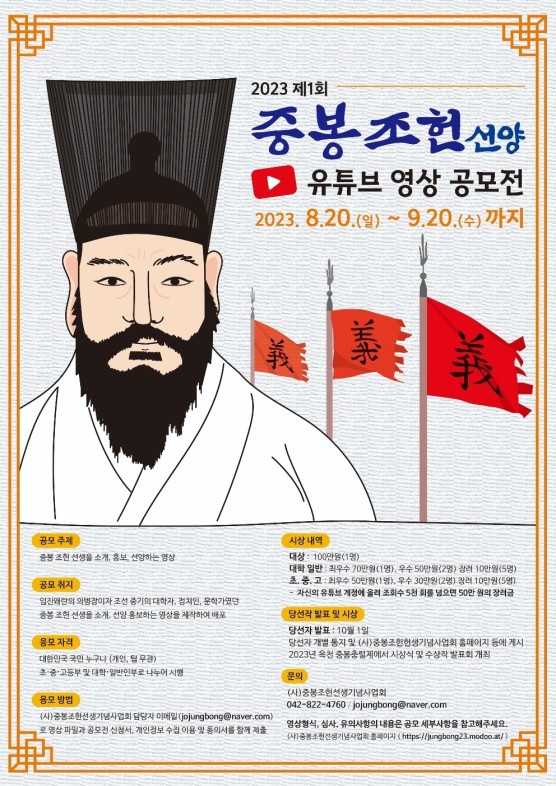 ○공모 취지 임진왜란의 의병장이자 조선 중기의 대학자, 정치인, 문학가였던 중봉 조헌 선생을 소개, 선양 홍보하는 영상을 제작하여 배포 ○공모 주제 중봉 조헌 선생을 소개, 홍보, 선양하는 영상 ○공모 기간 2023.8.20. \~ 9.20. ○응모 자격 -대한민국 국민 누구나 (개인, 팀 무관) -초·중·고등부 및 대학·일반인부로 나누어 시행 ○시상 내역 -대상 100만원(1명) -대학 일반: 최우수 70만원(1명), 우수 50만원(2명) 장려 10만원(5명) -초중고: 최우수 50만원(1명), 우수 30만원(2명) 장려 10만원(5명) - 자신의 유튜브 계정에 올려 조회수 5천 회를 넘으면 50만 원의 장려금 지급 ○응모 방법 - (사)중봉조헌선생기념사업회 담당자 이메일( @naver.com)로 영상 파일, 공모전 신청서, 개인정보 수집 이용 및 동의서 제출 ○당선작 발표 및 시상 -당선자 발표: 10월 1일(예정) -당선자 개별 통지 및 (사)중봉조헌헌생기념사업회 홈페이지에 게시 -2023년 옥천 중봉충렬제에서 시상식 및 수상작 발표회 개최 ■ 공모 세부 사항 ○ 영상 형식 -동영상 길이: 40초 이상 110초 이하 -1인(1팀)당 기본 1개, 최대 2개까지 영상 제출 가능 -2개 영상 제출 시 중복 수상 가능 -영상 내에 '중봉 조헌’, ‘중봉조헌선생기념사업회' 자막 삽입 -주요 내용, 강조점 등에 자막 삽입 -애니메이션, 모션그래픽, 쇼츠 등 동영상 장르에 제한 없음 -화질: FullHD(1920x1080) 이상, 세로 비율 가능(1080x1920이상) -일반적 PC, 휴대전화에서 재생 가능해야 함.(avi, mov, mp4 등) -코덱 h.264 권장, 비트전송률 10Mbps 이상 권장, 16:9 또는 9:16 비율 권장 ○심사 - 심사방법: 1차 예비심사 → 2차 본심사 (내·외부 심사위원으로 구성) - 심사기준: 영상의 몰입도, 참신함, 홍보효과, 완성도 등 - 동점일 경우 몰입도, 참신성, 완성도 고득점자 순으로 선정 - 제출된 동영상 수준과 심사 결과에 따라 선정 규모가 조정 될 수 있음 ○유의사항 응모자는 (사)중봉조헌선생기념사업회 홈페이지나 각종 출판물, 연구자료, 인터넷 사이트 등에서 중봉 조헌 선생 관련 객관적이고 기본적인 자료를 확보한 후 이를 바탕으로 영상을 제작해야 함. - 입상작은 영상 내 잘못된 정보에 대한 수정 요구 시 이를 반영해야 함. - 수상한 영상의 저작권은 (사)중봉조헌선생기념사업회에 귀속됨. - 초상권, 저작권 등 작품 관련 분쟁 시 법적 책임을 비롯한 모든 책임은 응모자에게 있음. - 타 공모전 수상작, 지적재산권 침해, 초상권 및 타인의 명예를 훼손한 작품, 타인의 저작물 및 명의를 도용한 경우 수상이 취소되고 상금이 환수될 수 있음. - 입상작은 주최측이 필요에 따라 수정 또는 변형해서 사용할 수 있음. - 심사점수는 비공개로 함. -대상 및 최우수상 수상작이 없을 경우 제외함 ○ 문의 - (사)중봉조헌선생기념사업회: (042-822-4760) / jojungbong@naver.com - (사)중봉조헌선생기념사업회 홈페이지: https://jungbong23.modoo.at/