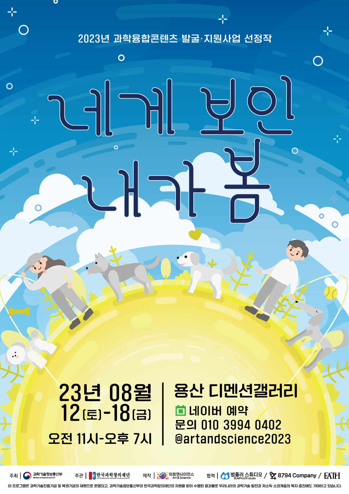 반려동물 동반 과학전시 [네게 보인, 내가 봄] 나와 가장 가까운 존재인 반려견가장 가깝게 교감하는 존재지만, 우리는 정말 그들을 이해하고 있을까? 반려견의 눈에 비친 세상, 그리고 나는 어떤 모습일까? 반려견 동반입장 가능/ 체험전시 / 케어키즈존 운영/ 마킹존구비 2023. 08. 12 (토) \~ 2023. 08. 18 (금) 위치: 용산 디멘션 갤러리 (서울 용산구 한강대로 58-1) 예매 : 네이버 예약https://booking.naver.com/booking/12/bizes/942432 참고:https://www.instagram.com/artandscience2023/