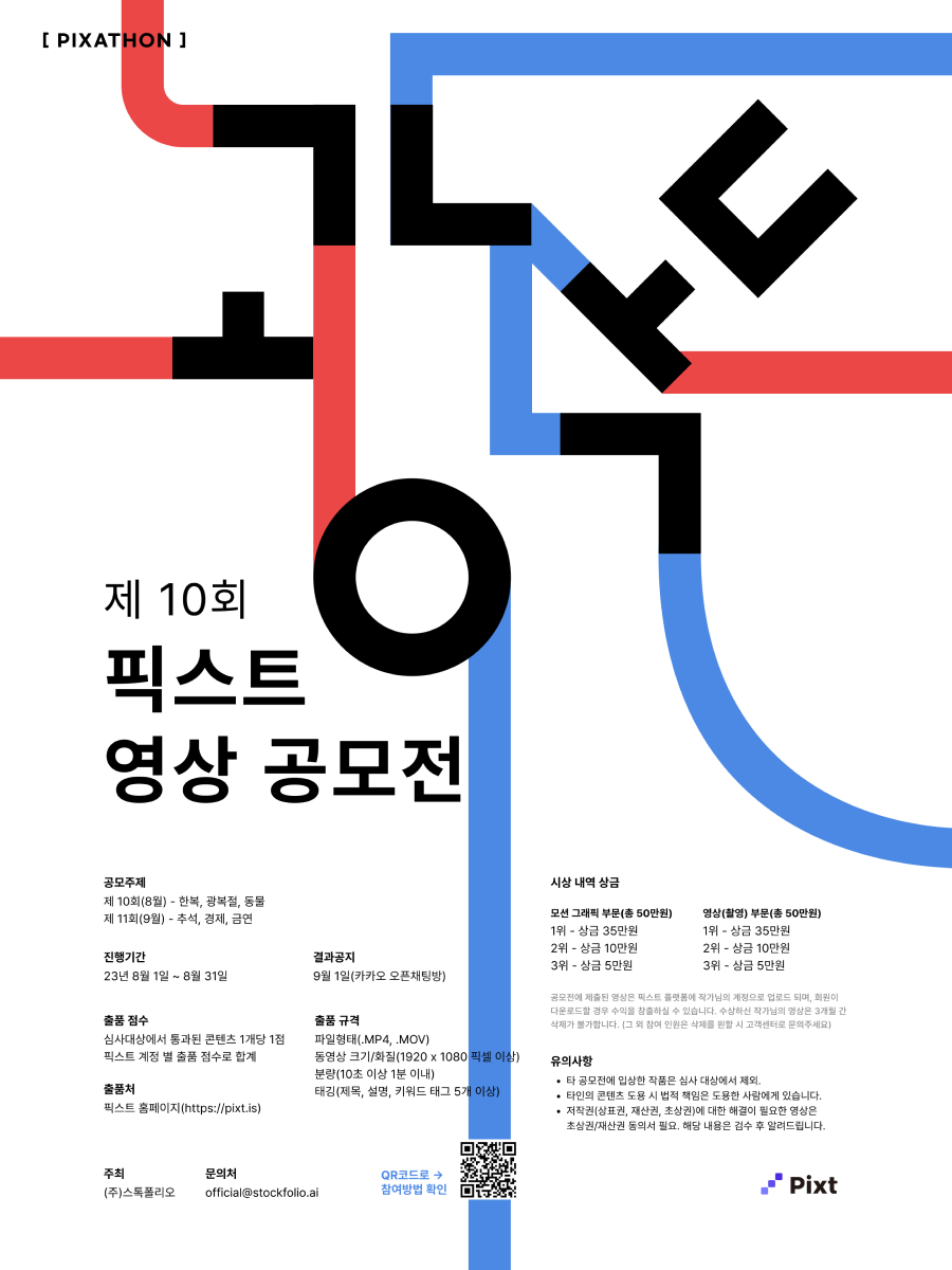 ○ 접수방법 - 홈페이지 참고 https://stockfolio.notion.site/PIXATHON-0d18a5158b8149a385dd2bab7992d2b3 ○ 출품규격 - 분량 (10초이상 1분 이내) - 동영상 크기/화질 (1920 x 1080 픽셀 이상) - 태깅 (제목\, 설명\, 키워드 태그 5개 이상) - 파일형태 (.MP4\, .MOV) ※ 자세한 내용은 공모전사이트 참고**