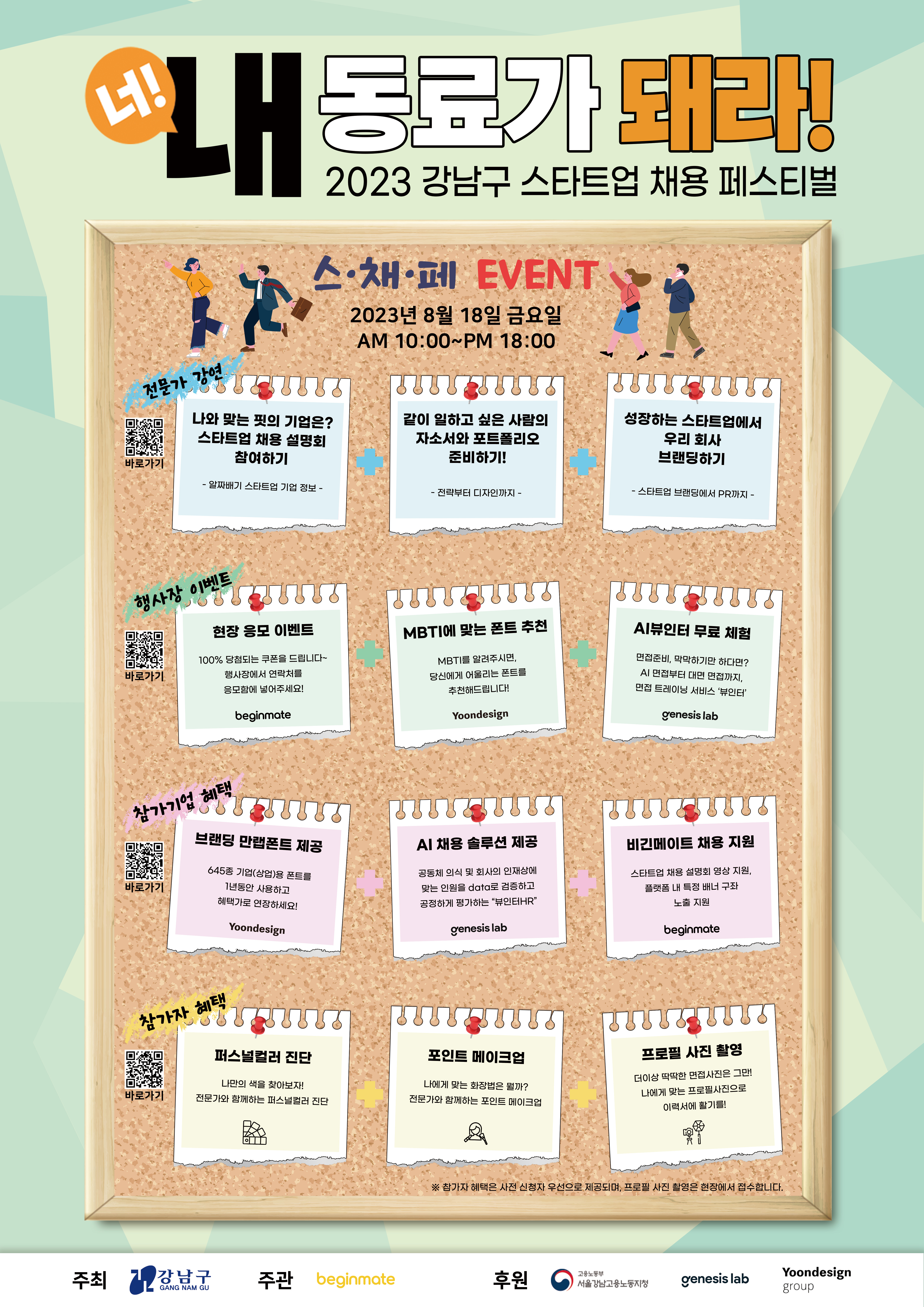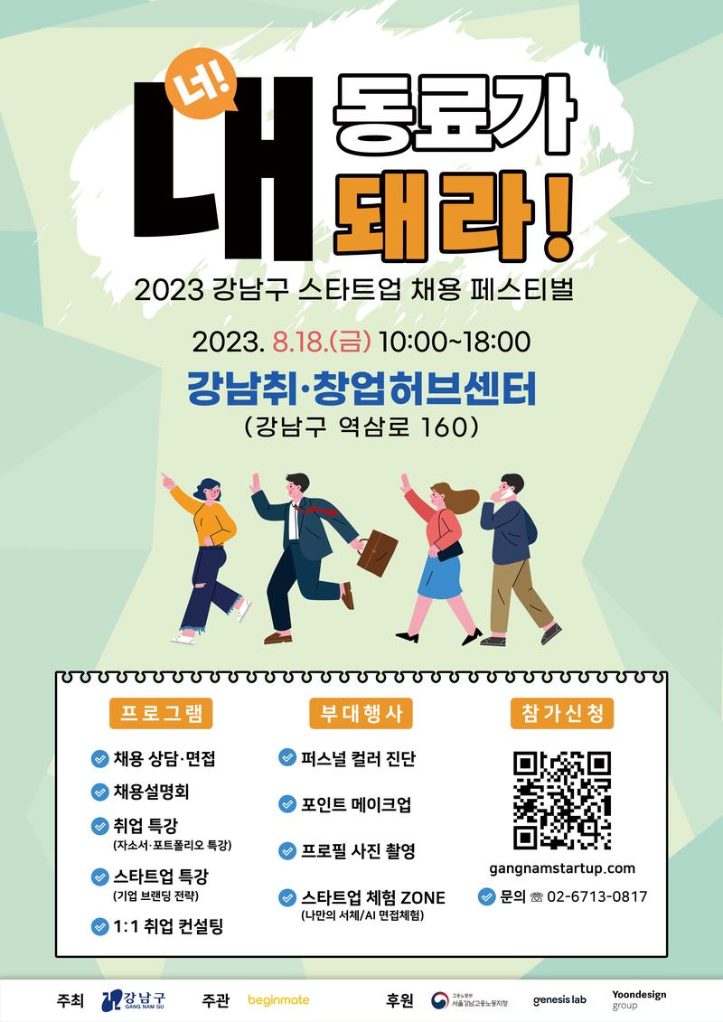 ◆ 신청문의 : 2023 스타트업 채용 페스티벌 운영기관 (주)비긴메이트 전화: 02-6713-0817 이메일: job@beginmate.com 홈페이지: https://gangnamstartup.com/