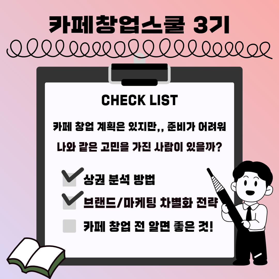 카페에 관심이 있고 창업에 관심이 있다면, 창업을 도전 해보고 싶어도 시작이 막막하고 막상 준비된 게 없어 망설여졌다면? 고민 말고 참여해보세요 ! 참가비 무료 !