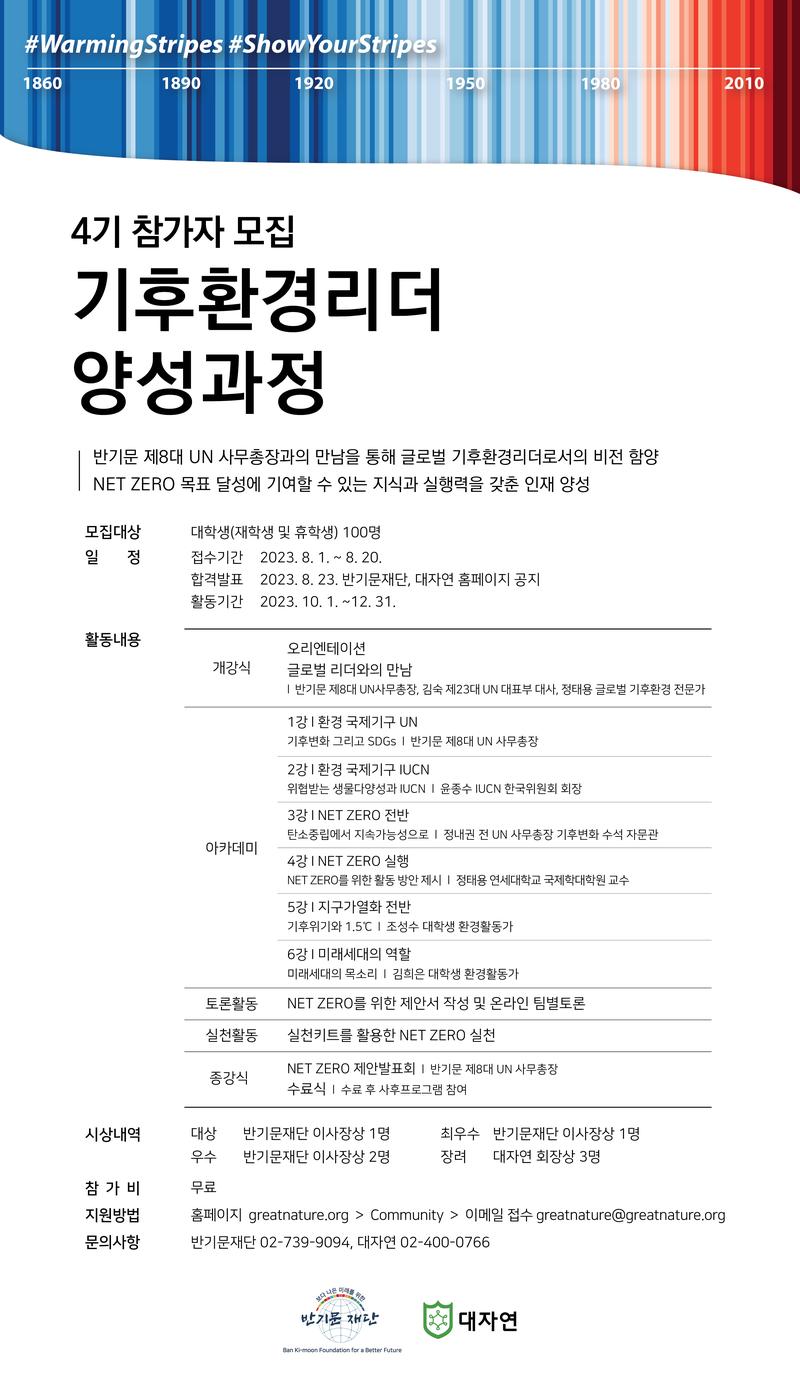 ■ 모집기간 : 8.1\~8.20 ■ 모집대상 : 대학(원) 재학생 및 휴학생 ■ 지원방법 : 반기문재단, 대자연 홈페이지 > 공지사항 활동가이드 확인 후 참가신청서 다운로드 > 이메일 접수 greatnature@greatnature.org - 공지사항 바로가기 https://bit.ly/4thCELTC ■ 문의 : 반기문재단 02-739-9094, 대자연 02-400-0766 ● 1기 개강식 영상 https://youtu.be/lLQNVTF0hRs ● 2기 종강식 영상 https://youtu.be/5FFMyOZmGMM