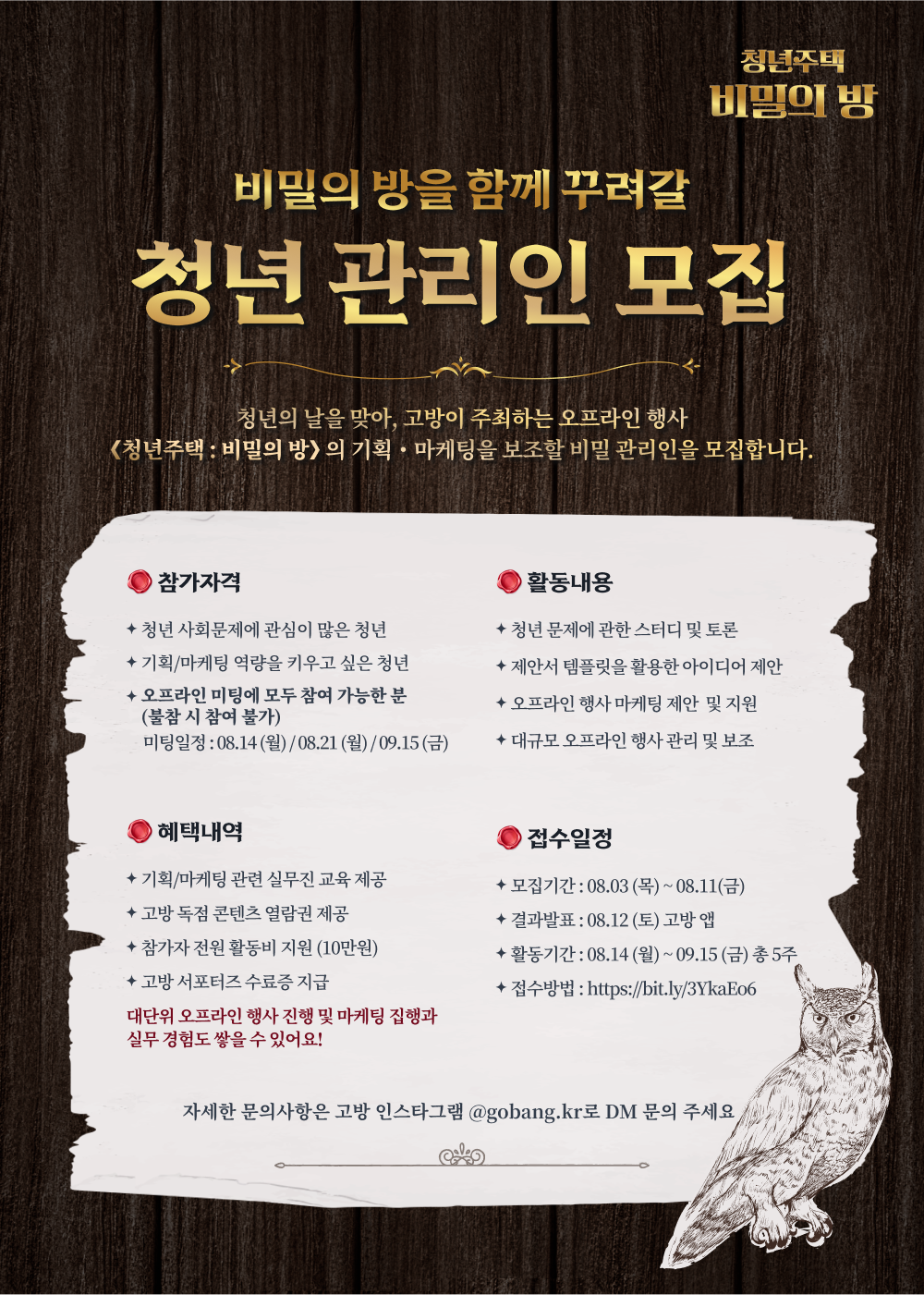지금 고방과 함께<청년주택 : 비밀의방>을 ▲운영하고 ▲마케팅할 ‘청년 관리인’을 모집합니다 !