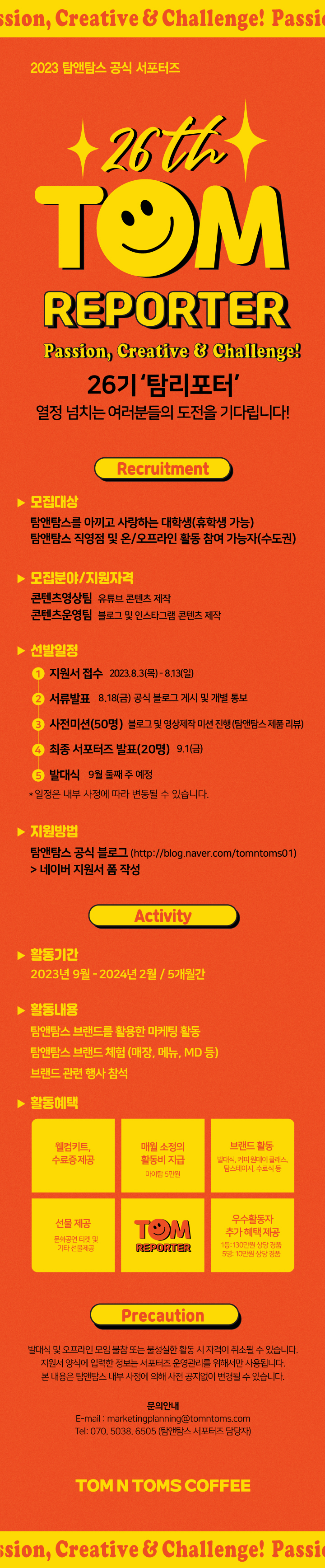 "마케터로서 경험도 쌓고 탐앤탐스 메뉴 및 브랜드 행사들을 체험할 수 있는 탐리포터 26기를 모집합니다." ●모집대상 - 탐앤탐스를 사랑하는 대학생(휴학생 가능) - 탐앤탐스 직영점 방문 및 온/오프라인 활동 가능자(수도권 거주) ●모집분야 - 콘텐츠영상팀 : 영상 콘텐츠(유튜브) 제작 - 콘텐츠운영팀 : 블로그 & 인스타그램 콘텐츠 제작 ●기간 및 일정 - 모집기간 : 2023.08.03(목) \~ 08.13(일) - 서류합격 발표 : 2023.08.18(금) 공식 블로그 게시 및 개별 통보 - 사전미션 체험단(50명) : 블로그 & 인스타그램 및 영상제작 미션 진행(탐앤탐스 제품 체험) - 최종 서포터즈 발표(20명) : 2023.09.01(금) ●활동내용 - 활동기간 : 2023년 9월 \~ 2024년 2월/ 5개월간 - 탐앤탐스 브랜드를 활용한 마케팅 활동 - 탐앤탐스 브랜드 체험(매장\, 메뉴\, MD 등) - 브랜드 관련 행사 및 모임 참석 ●활동혜택 - 웰컴키트 및 수료증 제공 - 매월 소정의 활동비 지급(마이탐 5만원) - 브랜드 활동(원데이 클래스\, 탐스테이지 등) - 선물 제공(문화 공연 티켓\, MD 상품 등) - 우수 활동자 추가 혜택 제공(1등: 130만원 상당 경품\, 5명: 10만원 상당 경품) ●참가방법 - 탐앤탐스 공식 홈페이지 또는 공식 블로그를 통하여 네이버 지원서폼 작성 - 탐앤탐스 공식 블로그 : https://blog.naver.com/tomntoms01/223173531442 - 온라인 지원 : https://naver.me/GqsV6ki0 *8/3 부터 지원가능 ●문의처 E-mail : marketingplanning@tomntoms.com Tel : 070-5038-6505 ●기타사항 - 발대식 및 오프라인 모임 불참 또는 미비한 활동 시 자격이 취소될 수 있습니다. - 지원서 양식에 입력한 정보는 서포터즈 운영관리를 위해서만 사용됩니다. - 본 내용은 탐앤탐스 내부 사정에 의해 사전 공지없이 변경될 수 있습니다.