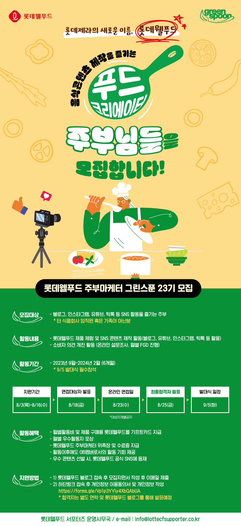 롯데제과의 새로운 이름, 롯데웰푸드가 음식콘텐츠 제작을 즐기는 “푸드 크리에이터” 주부님들을 모집합니다. - 롯데웰푸드 주부마케터 그린스푼 23기 모집 -
