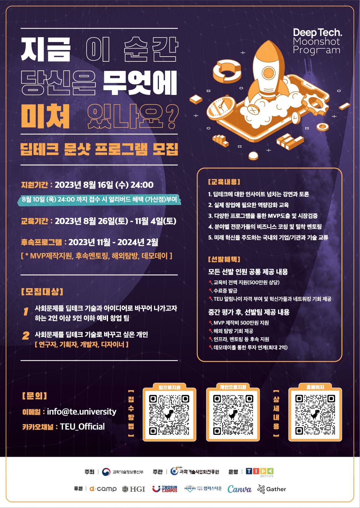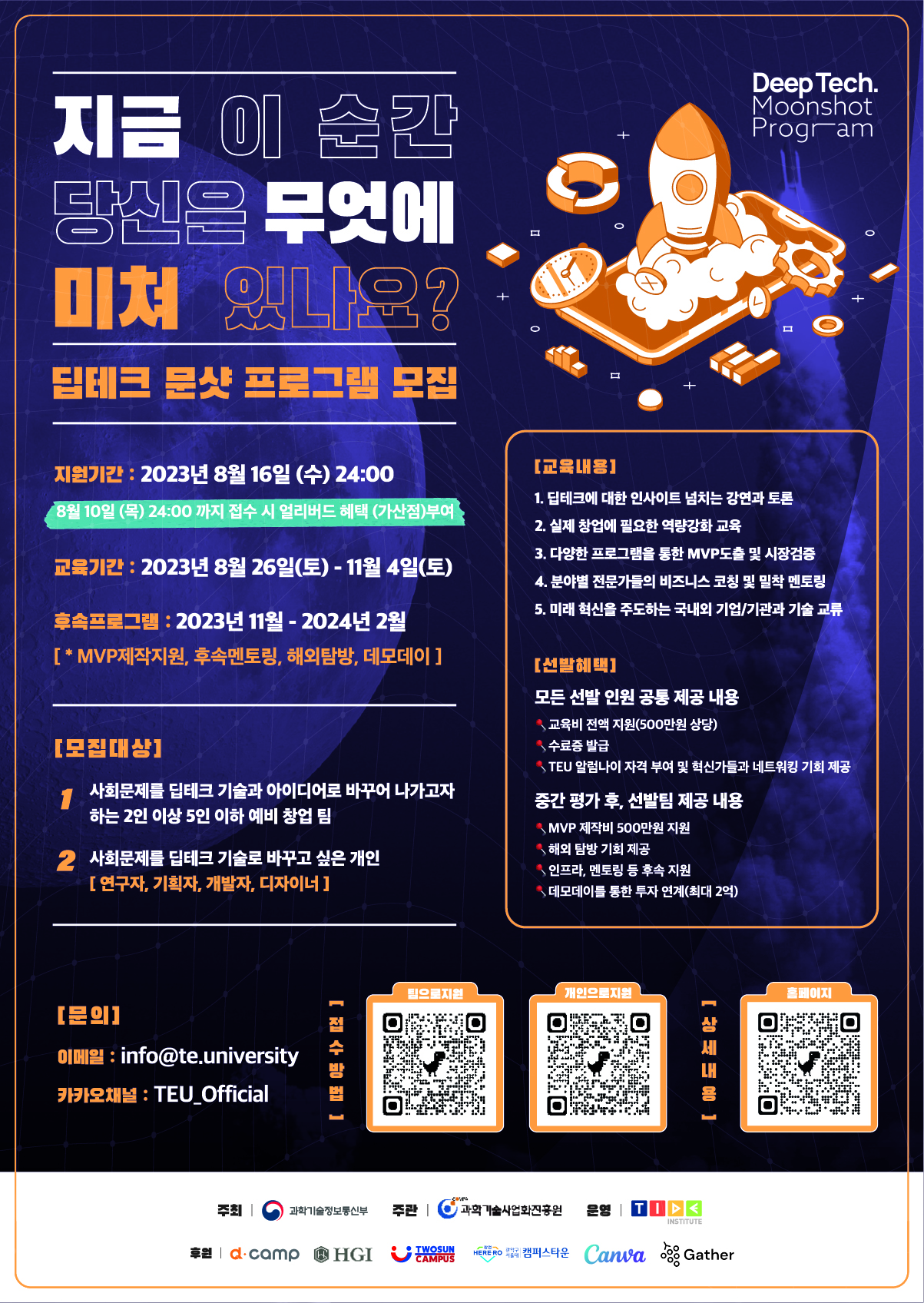 과학기술정보통신부 주최하고 과학기술사업화진흥원이 주관하는 Deep tech. Moonshot Program (이하 DMP)에 참가할 개인/팀을 모집합니다. DMP는 기하급수적으로 발전하는 과학기술로 인류가 직면한 거대한 문제에 대한 혁신적인 솔루션을 도출하고자 기술과 문제에 대한 폭넓은 강연과 토론으로 진행되는 혁신가 교육은 물론, 창업 교육, 팀 빌딩, MVP 지원과 데모데이를 통해 창업 및 투자 지원까지 원스탑으로 진행되는 프로그램입니다.