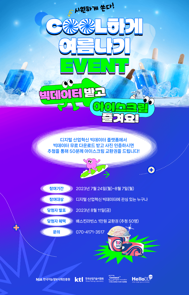 디지털 산업혁신 빅데이터 플랫폼에서 빅데이터 무료 다운로드 받고 사진 인증하시면 🖼️ 추첨을 통해 50분께 아이스크림 교환권을 드립니다!✨ 🌟 이벤트 참여하러 가기➡️ https://ddscience1.hellodd.com/2023/0718_data/ 🍨 참여 기간 : 2023년 7월 24일(월) \~ 8월 7일(월) 🍨 참여 대상 : 디지털 산업혁신 빅데이터에 관심 있는 누구나 🍨 당첨자 발표 : 2023년 8월 11일(금) 🍨 당첨자 혜택 : 배스킨라빈스 1만원 교환권(추첨 50명) 🍨 문의 : 070-4171-3517 📣 이벤트 참여 방법 ❄ 1단계 : 디지털 산업혁신 빅데이터 플랫폼 회원 가입하기(기존 회원은 바로 로그인!) https://www.bigdata-dx.kr/login ❄ 2단계 : 데이터마켓에서 빅데이터 1개 무료로 다운로드 받기 https://www.bigdata-dx.kr/product ❄ 3단계 : 빅데이터 다운로드 사진 인증하기 https://forms.gle/2FmdMR71bZL7yMdE6