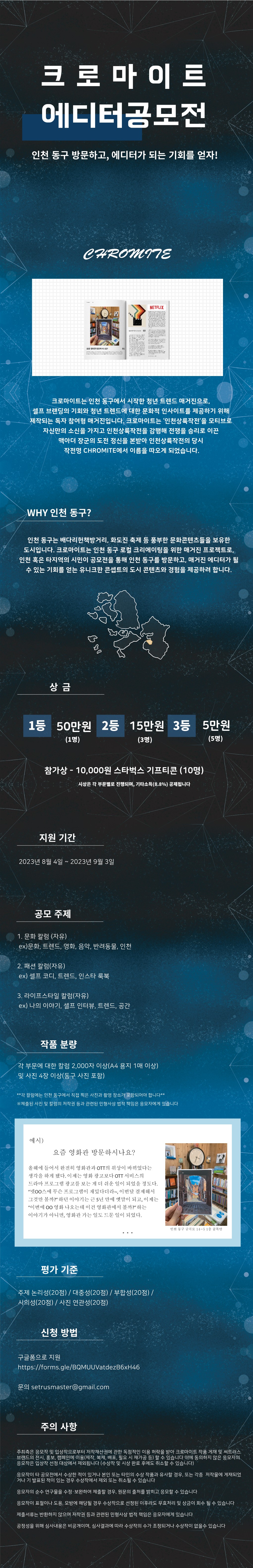 "인천 동구 방문하고, 에디터가 되는 기회를 얻자!" 인천 동구는 배다리헌책방거리, 화도진 축제 등 풍부한 문화콘텐츠들을 보유한 도시입니다. 크로마이트는 인천 동구 로컬 크리에이팅을 위한 매거진 프로젝트로, 인천 혹은 타지역의 시민이 공모전을 통해 인천 동구를 방문하고, 매거진 에디터가 될 수 있는 기회를 얻는 유니크한 콘셉트의 도시 콘텐츠와 경험을 제공하려 합니다.