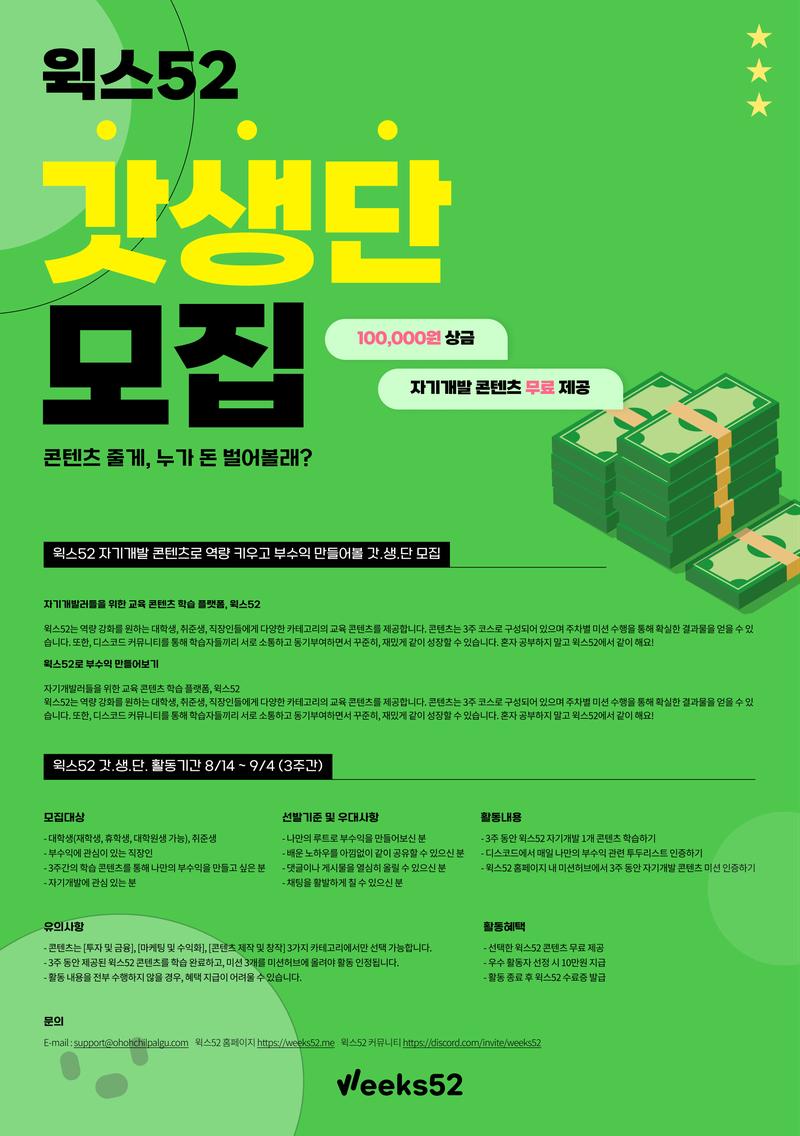 [지원방법] 1. 윅스52 홈페이지 가입하기 2. 아래 구글폼을 통해 지원하기 https://forms.gle/5R1wXnt1dXevuu359 [활동기간] 8/14 \~ 9/4 (3주간) [활동혜택]