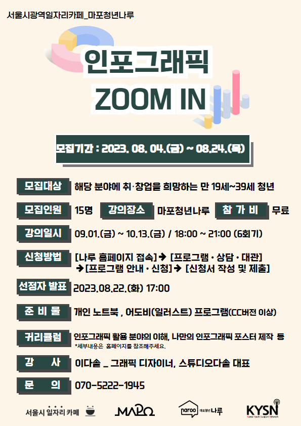 나루에서 취·창업을 준비 중인 예비/초보 디자이너분들을 위해 '인포그래픽 ZOOM IN' 프로그램을 진행합니다! 편집 디자이너에게 가장 중요한 부분인 정보를 시각화하는 방법부터 다양한 인포그래픽 활용 분야에 한걸음 더 가까워질 수 있도록 취업 혹은 나만의 디자인 창업을 준비 중인 청년분들을 위해 준비했는데요 : ) 다양한 인포그래픽 활용 분야와 개념의 이해도를 가지고 나만의 인포그래픽 포스터를 제작해볼 수 있는 커리큘럼으로 구성되어 있습니다. 디자이너로 취업을 그리고 창업을 희망하시는 분들은 나루에서 진행하는 '인포그래픽 ZOOM IN' 프로그램을 신청해 주세요!