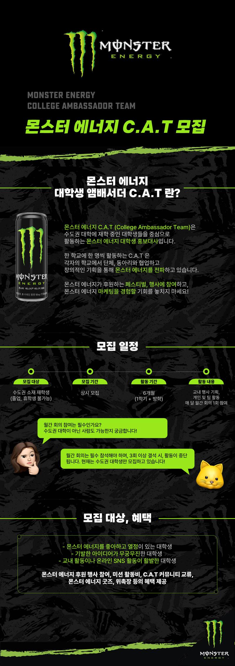 몬스터 에너지 C.A.T 이 궁금하다면? 현재 활동자 인터뷰 보러 가기! ➡️ https://naver.me/5dPUMLIs