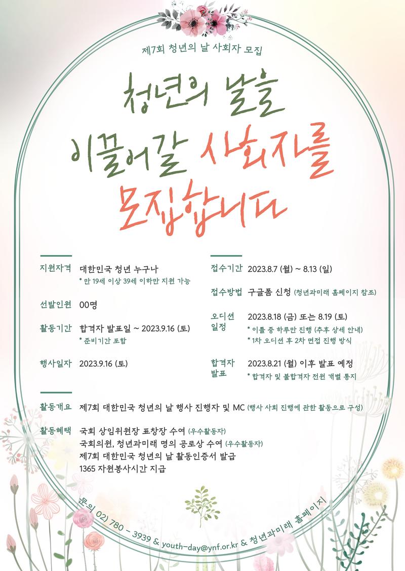 💗 제7회 대한민국 청년의 날 사회자 모집 💗 🔥열정 넘치는 청년이라면 주목🔥 대한민국 청년들이 직접 기획하고 참여하는 참여형 종합축제! 이번 청년의 날을 멋지게 진행해주실 사회자 여러분을 모집합니다!! 🔹 신청 자격: 대한민국 청년이라면 누구나! (만39세 이하) 🔹 신청 방법: 신청 구글폼, 청년과미래 홈페이지 공지 참조 (https://forms.gle/j2vnUthtXCEQecqL8) 🔹 모집 기간: 2023. 08. 13 (일) 까지 🔹 오디션 일정: 08. 18 (금) / 08. 19 (토) 중 1회 진행 🔹 활동 기간: 합격자 발표일 \~ 09. 16 (토) *준비 기간 포함 🔹 활동 개요: 제7회 대한민국 청년의 날 행사 진행자, MC 🔹 행사 일시: 09. 16 (토) (제7회 대한민국 청년의 날) 🔹 활동 혜택 - 국회 상임위원장 표창장 수여 (우수활동자) - 국회의원, 청년과미래 명의 공로상 수여 (우수활동자) - 제7회 대한민국 청년의 날 활동인증서 발급 - 1365 자원봉사시간 지급 🔹 문의 - 02)780-3939 - youth-day@ynf.or.kr - 홈페이지: www.ynf.or.kr 제7회 대한민국 청년의 날 사회자 모집에 많은 지원 부탁드립니다(●'◡'●)