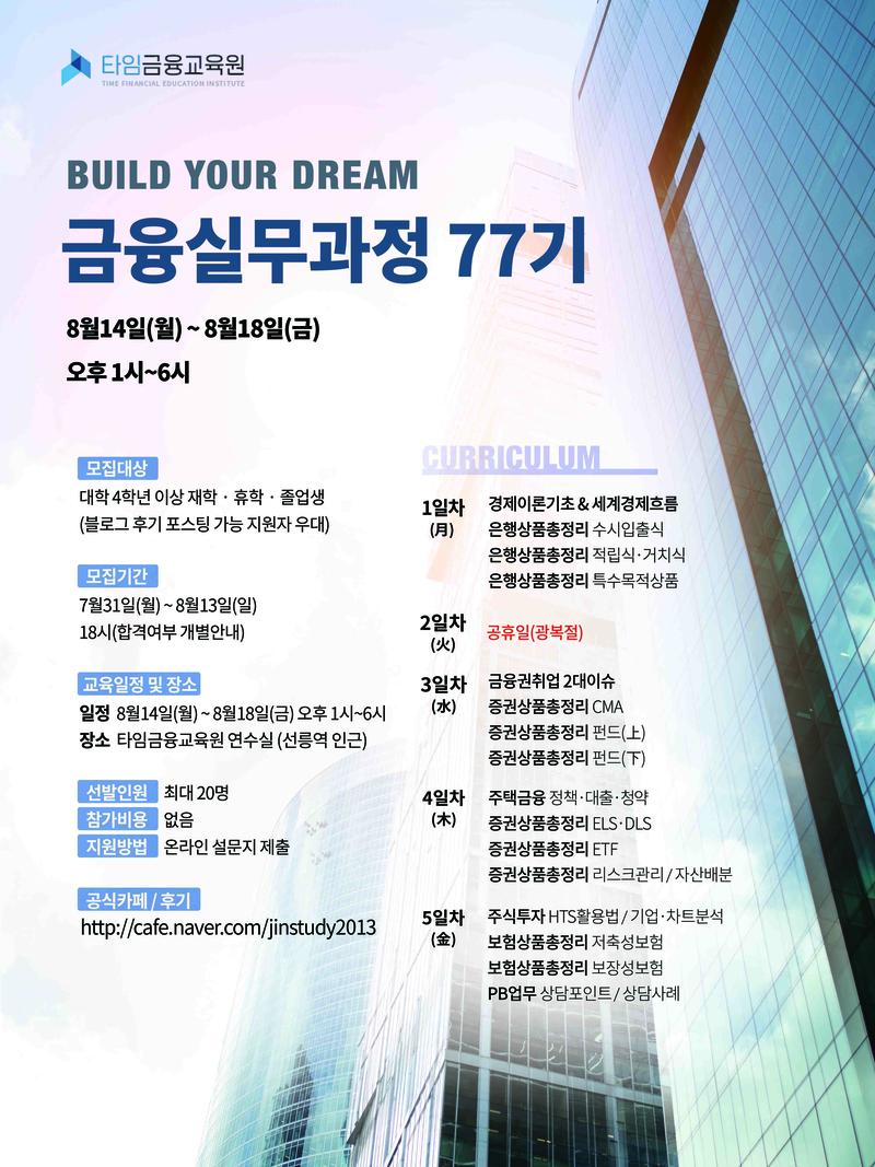 ▶ 신청기간 및 일정 - 신청기간 : 7월31일 \~ 8월13일 18:00 - 합격자 발표 : 합격여부 개별안내 - 교육기간 : 8월14일 \~ 8월18일 오후 1시\~6시 (8월15일 광복절 공휴일) - 장소 : 타임금융교육원 연수실 (선릉역 5번 출구\, 테헤란로 311 아남타워)