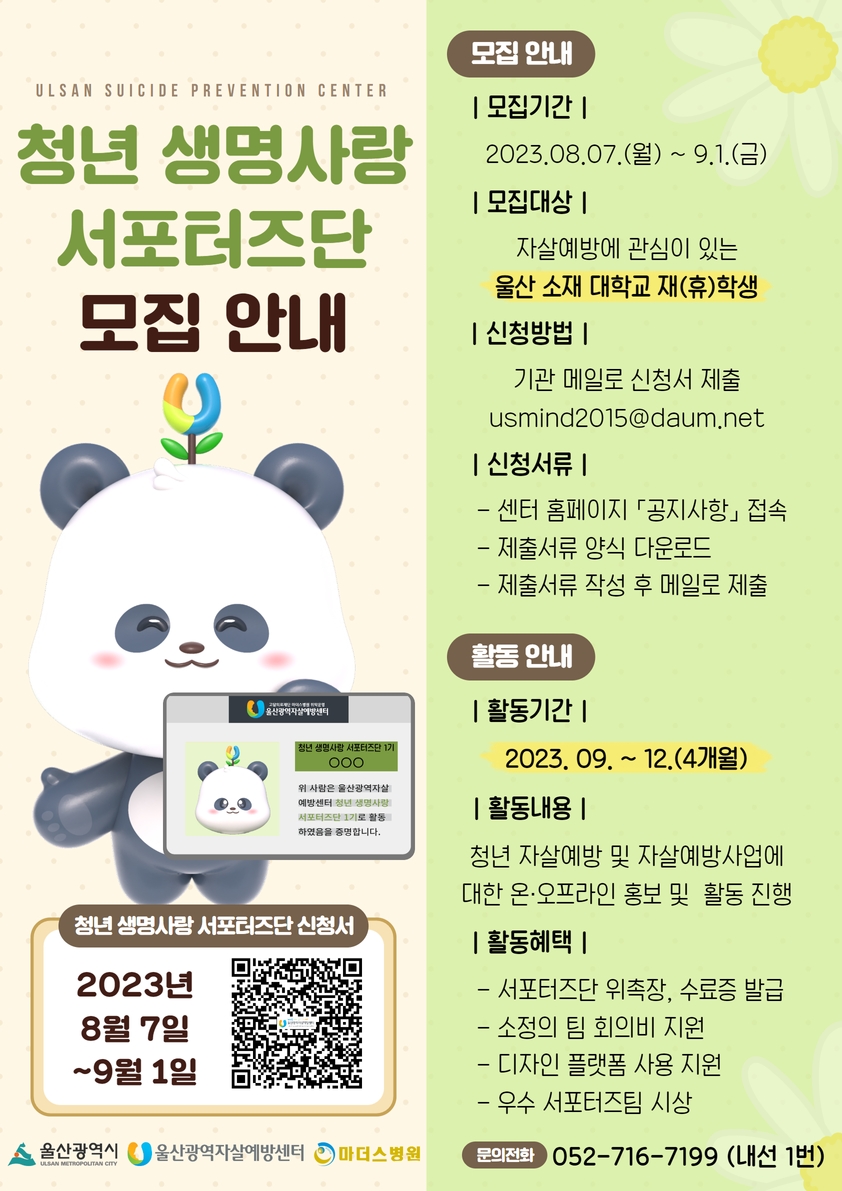 ■ 모집대상 * 자살예방에 관심이 있는 울산 소재 대학교 대(휴)학생 - 발대식(9.15.), 비대면 간담회, 해단식에 필수적으로 참여 가능한 자 - 월 1회 팀별 대면 정례회의에 참여할 수 있는 자 ■ 모집일정 * 모집기간: 2023년 8월 7일(월) \~ 2023년 9월 1일(금) * 모집발표: 2023. 09. 06.(수) 개별연락 ■ 지원방법 * 울산광역자살예방센터 홈페이지 혹은 본 공모전 첨부파일을 통한 지원서 양식 확인 * 지원서 작성 후 울산광역자살예방센터 이메일(usmind2015@hanmail.net)로 서류 접수 ■ 활동내용 * 발대식 : 2023. 09. 15.(금) 14:30 ※ 참석 필수 - 기관소개 및 사업안내 - 서포터즈단 위촉장 수여 - 자살에방 생명지킴이 양성교육 - 팀 선정 및 팀 활동 진행 * 서포터즈 활동 : 2023년 9월 \~ 12월(4개월) - 월 1회 이상 팀 정례회의 참석 - 청년 자살예방 및 자살예방사업 홍보 컨텐츠 제작 및 홍보 활동 - 매월 활동보고서 작성 및 제출 * 비대면 간담회 : 10월 중 예정 ※ 참석 필수 - 서포터즈단 활동 내용 공유 - 홍보 컨텐츠에 대한 팀별 피드백 - 활동 건의사항 공유 및 발전 방향 논의 * 해단식 : 12월 중 예정 ※ 참석 필수 - 서포터즈단 활동 보고 및 활동 소감 공유 - 우수 서포터즈단 선정 - 서포터즈단 수료증 수여 ※ 상기일정은 기관사정에 따라 변경될 수 있습니다. ■ 대외활동 혜택 * 서포터즈단 위촉장 및 수료증 수여 * 소정의 팀 회의비 지원 * 디자인 플랫폼 사용 지원 * 우수 서포터즈팀 시상 ■ 문의 사항 * 울산광역자살예방센터(☎ 052-716-7199, 내선번호 1번) * 이메일: usmind2015@hanmail.net