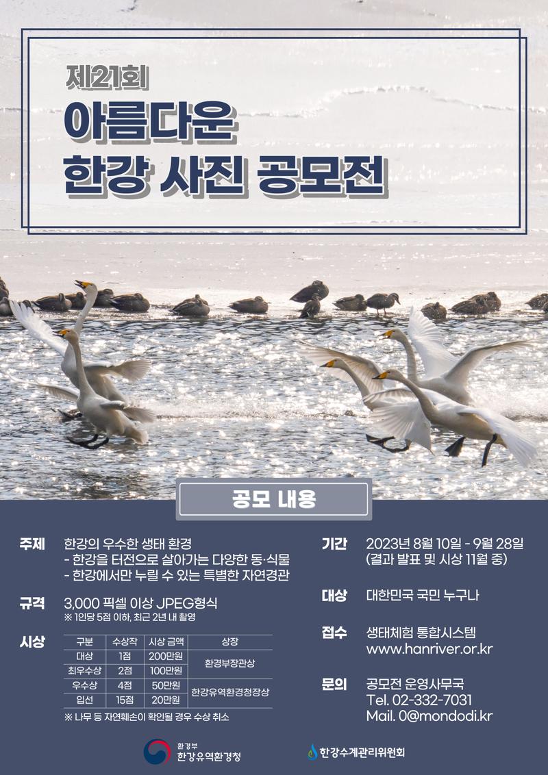 아름다운 한강사진 공모전은 환경부 산하 한강유역환경청에서 주최하는 사진 공모전입니다. 올해로 21회를 맞는 한강 사진 공모전은 한강의 우수한 생태 환경을 주제로 8월 10일부터 9월 28일까지 모집합니다.