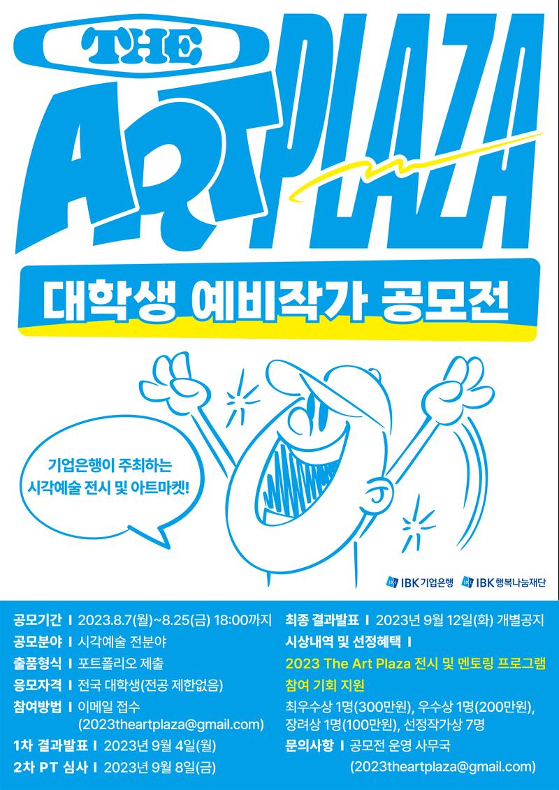 ○ 공모명 - 더아트프라자 대학생 예비작가 공모전 ○ 공모분야 - 시각예술 전분야(자유주제) ○ 공모기간 - 2023. 8. 7.(월) \~ 8. 25.(금) 18:00 ○ 심사절차 - 공고 및 접수 (8.7\~8.25) ▶ 1차 서류 심사 (8.28\~9.1) ▶ 2차 PT심사 (9.8) ▶ 최종 결과 발표 (9.12\, 개별 연락) ○ 응모 자격 - 전국 대학생 (학부 재학생/휴학생)\, 전공 무관 ○ 응모 방법 - 제출서류 : 공모전 참가 신청서\, 개인정보 수집/이용 동의서\, 재학증명서\, 포트폴리오(파일확장자 : pdf\, 30MB 이내) - 접수처 : 전자우편(2023theartplaza@gmail.com) 을 통한 온라인 접수 *방문·우편접수는 받지 않음 - 출품작 기준 : 전시 및 설치 가능한 작품으로\, 평면(100호 이내)\,입체(180*180*180cm이내) 미디어 작품의 경우 구동 가능한 하드웨어 일체 포함 *추후 전시 출품작은 운영사무국과 협의 후 선정 ○ 심사방법 - 1차 · 평가위원 : 내/외부 전문가 · 평가방법 : 서류평가 · 결과 : 2배수 선발 - 2차 · 평가위원 : 내/외부 전문가 · 평가방법 : 대면 PT 평가 · 결과 : 최종 10인 선정 ○ 시상 (2023 더아트프라자 오프닝행사(23.10.11)간 시상식 진행 예정) - 최우수상 (1명) 300만 원 - 우수상 (1명) 200만 원 - 장려상 (1명) 100만 원 - 선정작가상 (7명) - 시상혜택 : 전시 및 멘토링 프로그램 참여 (*미술계 전문가 멘토 참여 예정) ○ 문의처 - 공모전 운영사무국 : 010-2583-7724