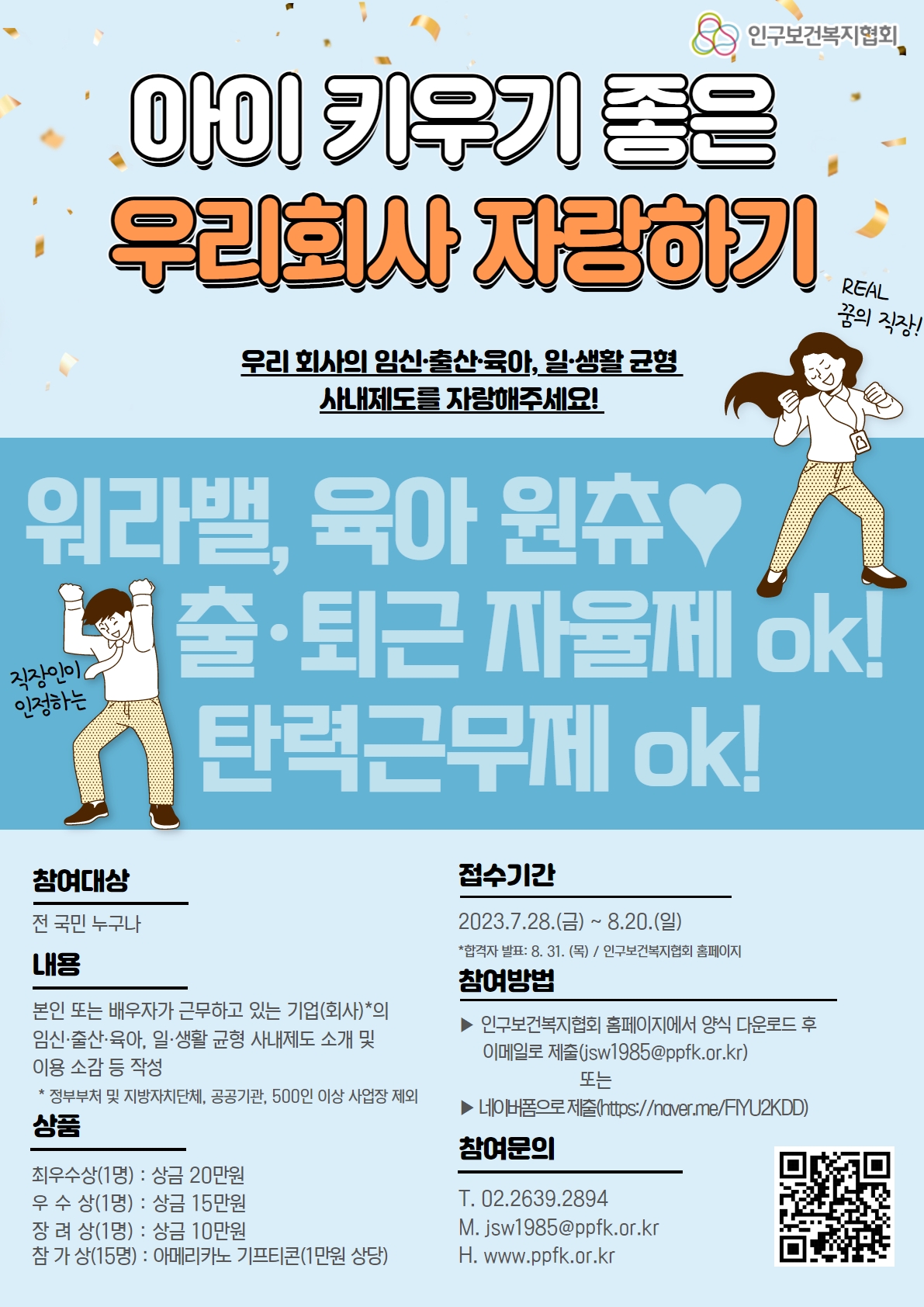 □ 이벤트명: 아이 키우기 좋은 우리 회사 자랑하기 □ 접수기간: 2023. 7. 28.(금) \~ 8. 20.(일) □ 참가자격: 전국민 누구나 □ 내용 ○ 본인 또는 배우자가 근무하고 있는 기업(회사)*의 임신·출산·육아, 일·생활 균형 우수 사내제도 자랑하기(소개 및 이용 소감) * 정부부처 및 지방자치단체, 공공기관, 근로자 500인 이상 사업장 제외 ○ 현재까지 추진 중인 사내정책 또는 제도 등을 구체적(대상, 지원내용, 혜택인원 등)으로 서술, 정부부처 지원 정책이 아닌 회사 자체적으로 시행 중인 고유의 정책 또는 제도에 대해 중점 작성