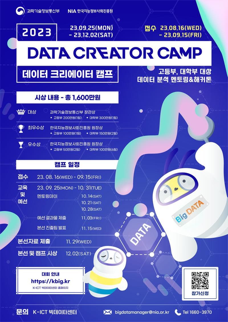 2023 데이터 크리에이터 캠프 고등부, 대학부 대상 멘토링 해커톤 미래세대의 데이터 분석 저변 확대와 창의력 증진을 위한 교육 + 멘토링 중심의 데이터 인재 육성 및 선발 프로그램